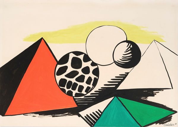 Alexander Calder made “Pyramids and Worlds” in 1970, with ink and gouache on paper. Look at the simple shapes, the kind a child might draw, but assembled in a way that makes you wonder what's up and what's down. It's playful, like his sculptures, but on a flat surface. I love how the colors are so direct, no blending, just pure hues slapped on. The ink outlines give everything a clear edge, a confidence, but also a kind of lightness, as if these shapes could float away. Notice that pyramid in the front, the one with the scribbled lines. It feels different from the others, more alive, like Calder couldn’t resist adding his own little flourish. It reminds me of Miró, but with a Calder twist. Both artists create these worlds that are both abstract and strangely familiar. It's like they’re inviting you to play with shapes and colors, to make your own sense of it all.