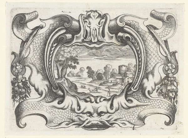 This engraving by Daniel Rabel features an elaborate cartouche, likely intended for framing text or an image. The cartouche itself, adorned with fruit and foliage, suggests abundance and fertility, classical symbols of prosperity. Two nude female figures flank the central landscape, holding aloft a draped cloth. These figures, reminiscent of classical nymphs, represent ideals of beauty and harmony. Consider how similar figures appear in Botticelli's paintings and Renaissance tapestries, emblems of beauty, and earthly delight. This motif of draped cloth, has its roots in ancient Roman art, where it symbolized status and honor. Over time, it has been reinterpreted to signify different themes, from modesty to revelation. The emotional power in this cartouche lies in its embrace of classical ideals intertwined with natural abundance. This engraving evokes a sense of timeless beauty and a yearning for a golden age, echoing through the ages in our collective memory. The classical motifs resurface in the collective consciousness.
