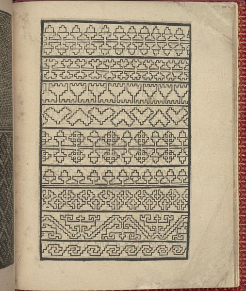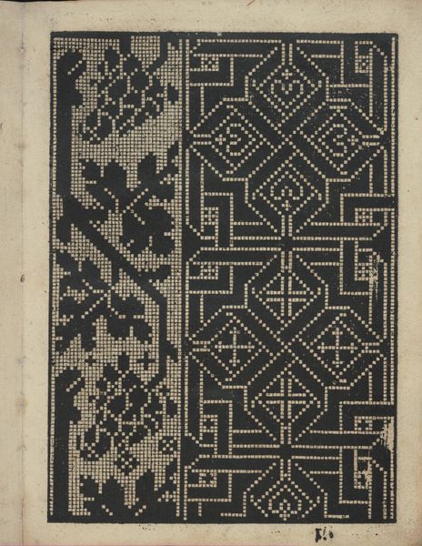 This page, printed by Willem Vosterman, is a woodcut, a relatively accessible medium for the time. The image showcases a series of patterns, likely intended as templates for embroidery or needlework. The technique involves carving a design into a block of wood, inking its surface, and then pressing it onto paper. What's left is the inverse of the carved design, a testament to the labor-intensive subtractive process. Woodcuts like these democratized design, making intricate patterns available to a broader audience beyond the wealthy. The regularity and precision achieved through the printing process speaks to a growing market for pattern books. The patterns are also a testament to the skill required to produce them: each dot is a cut into the block, removed by hand. By focusing on the processes of material production and its social context, we gain insight into the democratization of design and the changing landscape of labor and consumption.