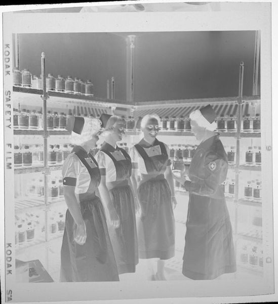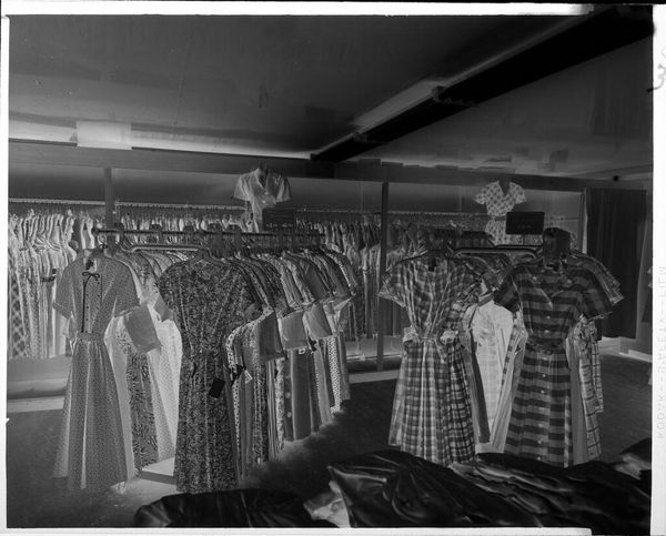 Editor: This untitled photograph by Martin Schweig shows three women in what appears to be a warehouse setting. One woman is modeling a dress while the other two are observing her. What symbols do you see at play here? Curator: The dress itself is a potent symbol. Consider its ruffles – they suggest adornment, perhaps a performance of femininity. Yet, in the stark industrial space, is this celebration or confinement? Note the negative space - the absence becomes a symbol of what is left unsaid. Editor: So the contrast emphasizes a tension? Curator: Precisely. The artificiality of display against the backdrop of labor. The woman's posture, the gaze of the others. Each element builds a complex cultural narrative. Perhaps the image questions the very act of viewing, of judgment. Editor: I hadn't considered the warehouse as a symbol itself, very interesting. Curator: The image's power lies in how it subtly layers those visual cues, inviting us to decode the shared meanings.
