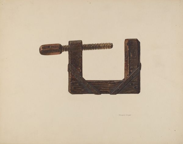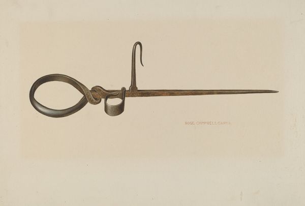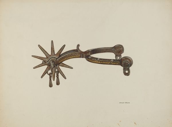 Editor: So, here we have Ethel Dougan's "Snaffle Bit," painted in 1938, using watercolor on paper. It's such a detailed depiction of… well, a snaffle bit! I find the simplicity of the subject almost meditative. What strikes you most about it? Curator: Meditative, yes! It's stillness rendered in delicate washes, a dance of rust and quiet strength. For me, it speaks of forgotten labour. I imagine a leather-creased hand polishing this bit, the breath of a horse frosting winter air. Tell me, does the aged quality evoke something in you, perhaps a story or a fragment of a memory? Editor: I think about how objects hold so much history, even everyday ones. And the bit isn’t idealized, it shows the wear and tear, the patination... that feels authentic, even respectful. Curator: Exactly! Dougan captures time itself. But let's dig a bit deeper. The watercolour technique, so ethereal… Does the combination of subject and medium spark any thoughts for you? Does this contrast create something unique? Editor: I guess I wouldn’t expect such a heavy, utilitarian object to be rendered with such delicacy. It almost softens the tool, humanizes it. It makes me consider our relationship with animals, with work. Curator: Beautifully put! It’s a reminder that even the most functional objects carry layers of meaning and artistry. So, in the end, what do you think Dougan wanted us to take away from this? Editor: That beauty and history can be found in the most unexpected places. I'll definitely look at old things differently now. Curator: Wonderful. Maybe we should all try and find the art in the ordinary. It makes life so much richer, wouldn’t you say?