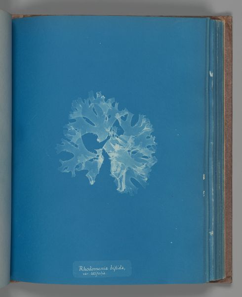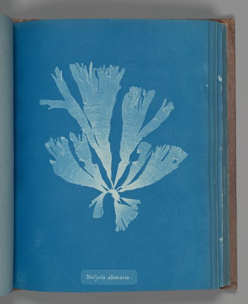 Curator: The ghostly image immediately gives me the feeling of underwater dreams and secret knowledge being unveiled. Editor: Here we have Anna Atkin’s cyanotype, “Polysiphonia thuyoides”, made between 1851 and 1855. This is an early example of photography found in her publication "Photographs of British Algae: Cyanotype Impressions.” Curator: The decision to render botanical specimens in monochrome blue also emphasizes a departure from the natural coloring of the sea plant. I'm curious, what is she conveying to us by choosing blue specifically? Perhaps the life giving energy and power of the ocean. Editor: The cyanotype process itself is so striking, isn’t it? Imagine coating paper with light-sensitive chemicals and then, using sunlight, fixing the delicate form of seaweed directly onto the page. The labor involved, even if relatively simple, allowed wider access and reproduction. It certainly disrupted previous methods for creating botanical imagery. Curator: Absolutely! This print, so simple at first glance, shows more than just a record of an object— the very blue suggests something elemental. Editor: Do you think that Atkins' own gender played a role? Here was a woman engaged with science when there were tremendous obstacles placed in her way. Her art reflects a certain kind of industrious curiosity. The cyanotype offered a method for the meticulous classification of specimens with comparatively little artistic skill required. It's a proto-scientific documentation made available and more precise. Curator: Precisely, and while the objective data is apparent, I can't help but wonder about its enduring symbolic draw. Does that blue connect to a vast and mysterious unseen world for us? Editor: I'm drawn back to that original notion of wider accessibility: consider how the production and replication enabled knowledge dissemination through this publication. This democratizing effect reshaped visual culture in fascinating ways. It brings to mind our own production methods here and access, too. Curator: Looking at Atkins’ work, I'm now seeing not just a photogram, but a relic with the feel of forgotten realms made manifest in brilliant indigo. Editor: Indeed, it makes you rethink what it means to document, to share, and to really see.