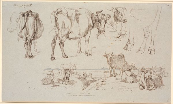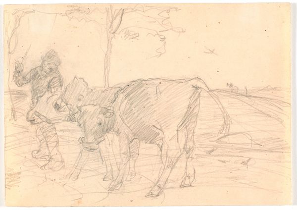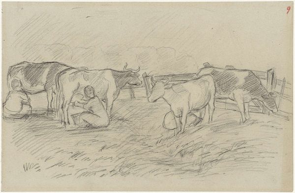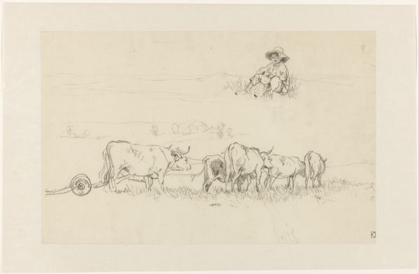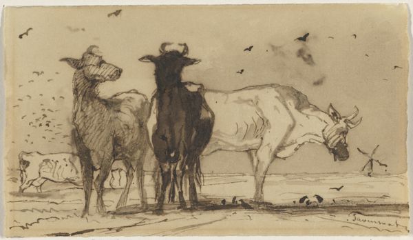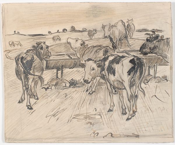 Theodor Philipsen created this small drawing, "Køer på en mark," using ink on paper. The quick, economical lines suggest Philipsen sketched this 'en plein air,' capturing a fleeting moment of cows grazing. The paper itself has a warm tone, providing a soft backdrop to the stark lines of the ink. Note how the artist uses the varying pressure of the pen to create a sense of depth and shadow. The cows in the foreground are rendered with bold, confident strokes, while those further away are suggested with lighter, more tentative marks. This work is a reminder that drawing is an act of both observation and reduction. It invites us to consider the labor involved, not just of the artist's hand, but also of the pastoral scene he depicts. The image prompts reflection on the social context of dairy farming. By focusing on the everyday, Philipsen elevates the mundane, and blurs the lines between high art and the humble realities of working life.