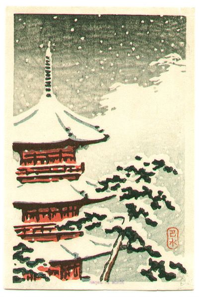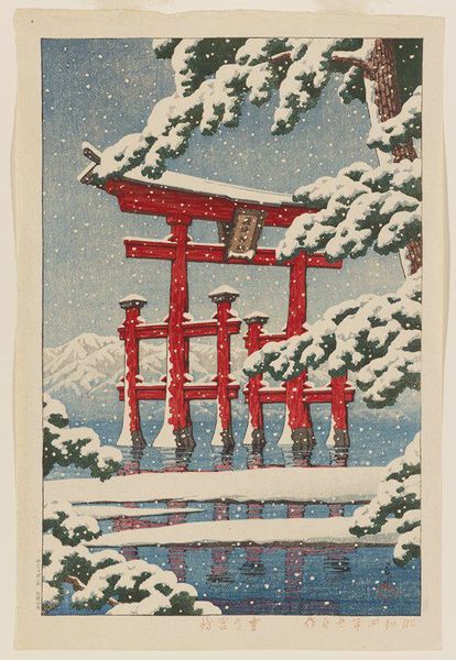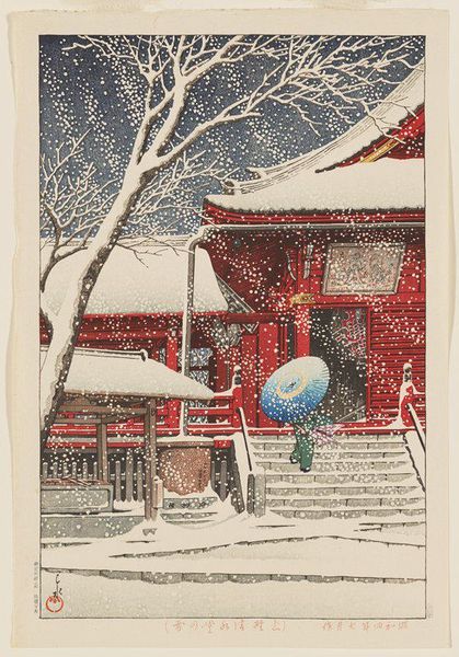 Curator: Here we have Hasui Kawase's woodblock print, "Snow at Zoji Temple," created in 1939. A stunning example of Shin-Hanga, or "new prints." Editor: It’s utterly charming. The dominant reds against the heavy snow evoke such a strong sense of warmth amidst the cold. And those figures under the umbrella – so small, but they create such a powerful story. Curator: Indeed. Kawase revitalized traditional ukiyo-e techniques, blending them with Impressionistic sensibilities that reflected changing tastes and influences in early 20th-century Japan. His work offers insight into how Japanese identity was being shaped by global encounters. Editor: Look how the temple practically glows. In Shintō, red symbolizes vitality and protection. Does this winter scene suggest a desire for refuge? Perhaps reflecting unease surrounding the war? Curator: A compelling point. In a turbulent era, Kawase was documenting disappearing landscapes in an increasingly modernizing Japan. Ukiyo-e and its modern versions allowed people to retain some connection to places and moments which were slipping from memory. The preservation of such memory would resonate widely through all levels of society. Editor: Those small figures feel weighted down by something beyond the snow; their world changing fast. I find it touching and subtly poignant. This piece carries more than its charming surface lets on. Curator: Shin-hanga, as this print exemplifies, was supported by publishers who were deeply engaged with the culture, keen to promote Japanese identity and craftsmanship through a period of intense Western influence. The red gate then reminds us not only of warmth, but also the fortitude and strength of identity which would withstand changing tides. Editor: It’s a world on the cusp of profound change, beautifully captured. I will certainly revisit this quiet slice of history. Curator: Agreed. There's a captivating tranquility in this image; a space for contemplating fleeting beauty in a complex time.