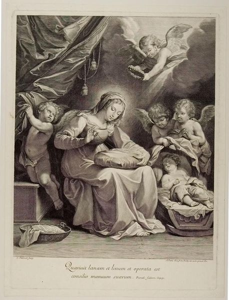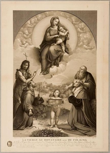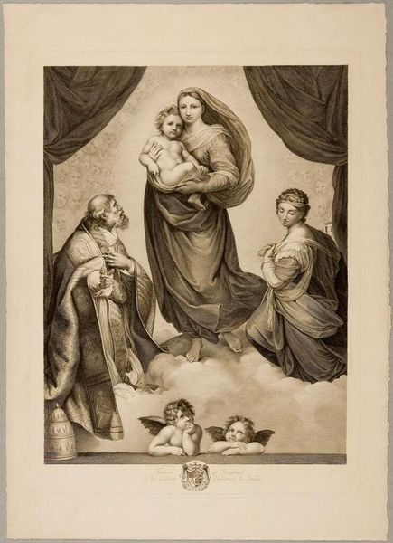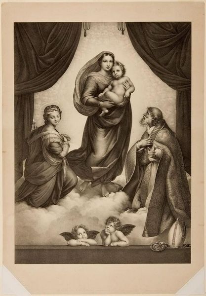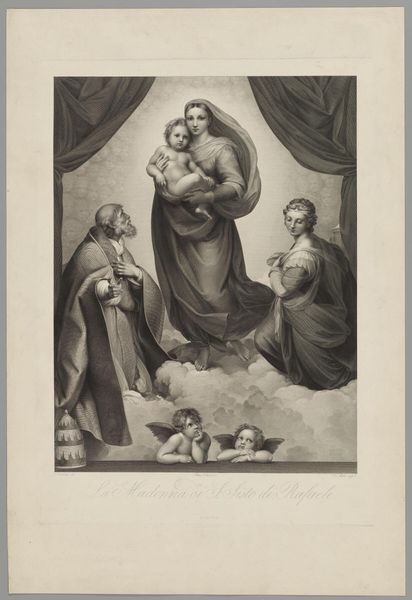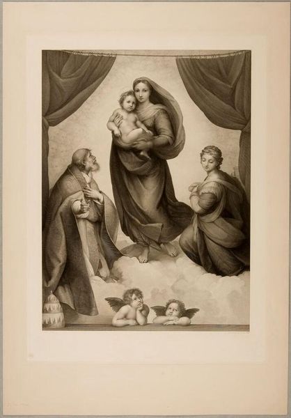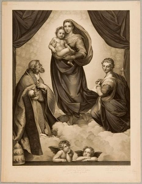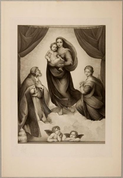 Curator: I'm struck by the textural contrast; even in monochrome, one senses weight, from the heavy drapery to the delicate wings of the cherubs. Editor: Indeed. What we are viewing is Johann Friedrich Wilhelm Müller’s "Sistine Madonna," now residing at the Harvard Art Museums. Curator: The Madonna's serene gaze juxtaposed with the direct, almost accusing stare of the Christ Child...it’s an interesting emotional push and pull. It references centuries of visual language surrounding divine motherhood. Editor: Müller was a printmaker; note the fineness of the lines, the labor invested in replicating the nuances of the original painting. It’s about dissemination, about making the sacred accessible through reproduction. Curator: Yes, and consider the cultural endurance of this image, how it continues to resonate. The cherubs alone have become ubiquitous. Editor: A testament to the power of accessible art, wouldn't you say? Something skillfully manufactured that transcends its materiality. Curator: Perhaps. I see it as a mirror reflecting our evolving relationship to faith and beauty. Editor: And I see the echoes of skilled labor shaping our perception. A lovely debate, don’t you think?