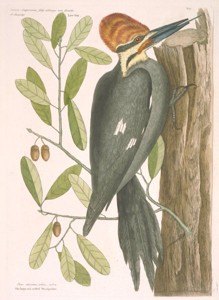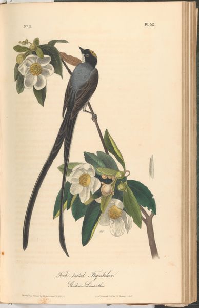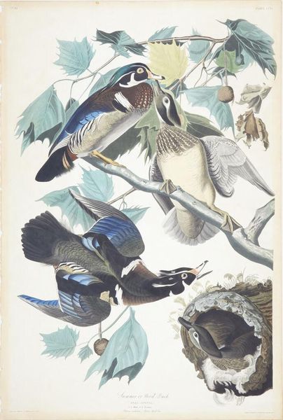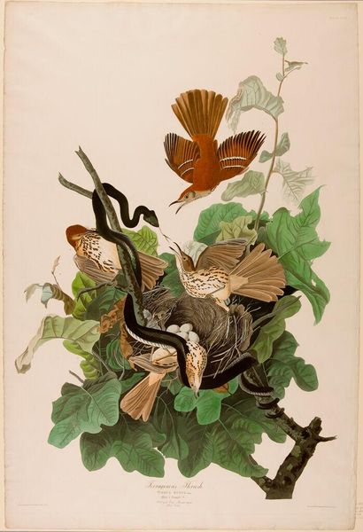 Curator: I am immediately drawn to the serenity of this print. There is such gentle energy between the hummingbirds and trumpet vine blossoms. Editor: Absolutely. What you're responding to is John James Audubon's "The Birds of America from Drawings Made in the United States," created around 1842. Audubon's depictions naturalize American identity with romanticism. Curator: These naturalistic studies of the ruby-throated hummingbird provide a key into how Audubon conceptualized the landscape. What I notice in Audubon’s depictions is this intense attention to detail coupled with a spiritual weight given to each species in its landscape. How do we understand that weight today? Editor: Well, there's a complexity when considering Audubon, an ornithologist whose fame rests on celebrating biodiversity in an era of immense environmental change. His depictions ignore the impact colonization has had, which arguably informs what we think about with “naturalism” or plein air art today. He leaves out conversations of Indigenous ecological practices and the devastating impacts westward expansion had upon ecosystems, essentially creating an image of natural paradise to fuel destructive industries. Curator: Yet there is value in recognizing how these romantic interpretations shaped cultural perceptions of American wilderness at a particular historical moment, even in their troubled ways. We might also consider Audubon's choices concerning medium: print, colored pencil, and watercolor. There is a textural intensity. Editor: Precisely. By looking through these botanical studies we come to recognize the naturalized ideal against the historical reality and devastation faced by our natural ecosystems. These studies hold value because they mark that moment in time that should hold us accountable in protecting what's left. Curator: You’ve given me much to consider, contextualizing this natural beauty against complex colonial undercurrents that run throughout. Editor: And you've highlighted the importance of iconography for revealing layers of meaning behind surface aesthetics. It's this dual awareness, I think, that helps us to truly see art's relevance today.
