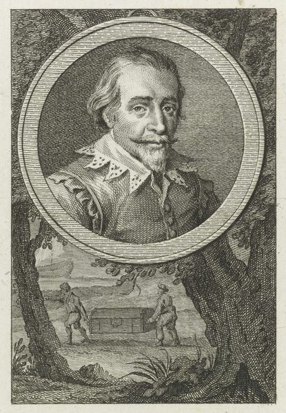 Curator: Here at the Rijksmuseum we have "Portret van Frans van Donia," an engraving created between 1866 and 1868 by Jan Frederik Christiaan Reckleben. Editor: It has an undeniably austere quality. The stippled background contrasts sharply with the subject's crisp depiction. Curator: This effect emerges from the painstaking nature of the engraving process itself. Note the fine lines and dots that form the image; they speak to hours of labor and the precise control the artist needed. The use of engraving as a medium in this era also emphasizes the rise of print culture, where portraits could be replicated and circulated widely, thereby shaping perceptions of historical figures. Editor: Right. And considering Donia’s coat of arms beneath the portrait, you get a strong sense of historical and societal standing. He isn't merely an individual; he's a representative of lineage, privilege, and inherited power—consider the symbolism implicit in crests such as these and the impact of aristocratic and bourgeois culture. Curator: Absolutely, the texture suggests high-quality paper, speaking to the materials used, and that reflects upon the craftsmanship and expense involved. This object wasn't simply 'made'; its making reinforces social hierarchies. Editor: It brings to mind questions around the politics of portraiture at the time, and I would say it acts as an endorsement of certain social values. Who commissioned it, and to what end? This isn't just about a person, but an idea of a person, preserved through artistic means, that upholds dominant class systems and patriarchal legacies. Curator: Thinking about how it was manufactured for a specific purpose, a reproduction used perhaps for promotional reasons? This kind of art serves purposes that stretch beyond pure aesthetics. Editor: Indeed. The portrait becomes a site of social contestation and negotiation. Ultimately, this is much more than just a static, historical image; it functions as a key to unlocking deeper discussions on culture, identity, and historical memory.