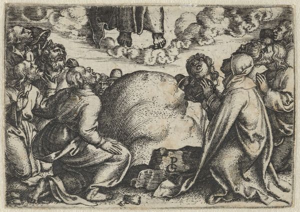 Editor: This is Georg Pencz's engraving, "Rich Man in Hell and Lazarus in Heaven with Abraham," created between 1542 and 1543. It’s striking how the composition divides the space, with heavenly figures on one side and a man engulfed in flames on the other. What’s your interpretation of this piece? Curator: Pencz's work reflects the intense religious and social anxieties of the Reformation era. Consider how the printing press, a relatively new technology, enabled the mass distribution of such imagery, directly impacting public perceptions of morality, wealth, and salvation. The clear visual distinction between Lazarus's blessed state and the rich man's suffering served as a powerful form of social commentary. What do you think this direct juxtaposition aimed to provoke in its original audience? Editor: It seems intended to make people question the social hierarchy and their own values. It’s like a visual sermon about the dangers of earthly riches. Curator: Precisely! And notice the artist's technique – the engraving. The medium itself lends to the work's didactic purpose, allowing for reproducible moral instruction across society. The very act of creating prints suggests a democratization of religious messaging. Think about how this image might function in different social settings—a wealthy merchant's home versus a public square. Editor: I hadn't considered the role of printmaking itself as part of the message. It makes me realize how carefully orchestrated the dissemination of such ideas would have been. Curator: It highlights the role of art not just as aesthetic experience but as a key player in social and religious debates. Editor: I’m starting to understand that it's about more than just the religious story; it's a product of a specific moment in history, shaping and being shaped by it. Curator: Exactly. By understanding the cultural context, we unlock richer meaning in what at first glance seems like a straightforward morality tale. Editor: Thanks, I definitely have a new perspective on the politics of imagery. Curator: Likewise. The layers of interpretation are always enriching to uncover together.