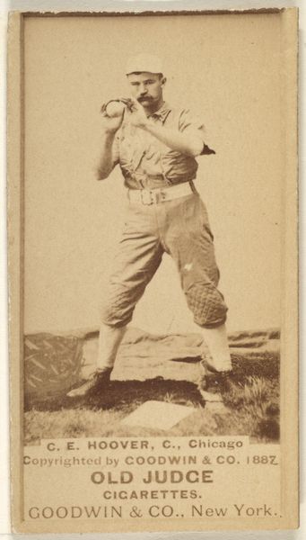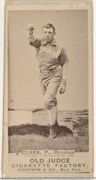 Curator: There's a strange, melancholic charm to this piece. Editor: Absolutely. This is a baseball card featuring Seward, a pitcher for the Philadelphia Athletics, made by Goodwin & Company around 1888, part of the "Old Judge" series designed as promotional inserts for cigarettes. What strikes you particularly? Curator: The sepia tone, of course, but also the rather surreal landscape behind him. He seems oddly placed, as if performing on some otherworldly stage, doesn't he? And something about his stare...lost in thought before the throw. Editor: The staged nature of early photography certainly contributes to that. And those rugged rocks and faded horizon evoke Romantic landscapes...a nod to grand artistic traditions applied to this humble piece of Americana. The symbolism suggests more than just a game, perhaps the confrontation between Man and Nature. Curator: Exactly! It elevates him, but also isolates him. Baseball became a myth in that era, it took on something transcendental. You can feel it there in this card, where an everyday image brushes the mythic. But isn't the Old Judge reference, advertising cigarettes, ironic for an athlete portrait? Editor: That irony is part of its cultural resonance now, I believe. Cigarettes were a widespread form of consumption, now demonized... linking aspiration (the athlete) with habits we now know as deeply destructive, there is the story of an epoch and our cultural journey, embedded into visual format. Curator: A premonition, in a way. But still, I find the composition incredibly dreamy. Even that somewhat awkwardly posed arm adds a layer of unexpected grace to this little photograph. Like poetry trapped in tobacco promotion! Editor: And, despite its intended purpose as a fleeting commodity, it became something iconic, now treasured in museum collections. Think of what meanings people attached to this object over a hundred years, and which one would make sense for us. This dialogue opens up just as much symbolic paths as the image itself. Curator: And I think it gives you hope; it tells you, anyone can become iconic. Editor: Absolutely. Thanks!
