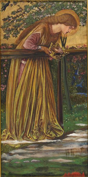 Curator: This image feels instantly…serene. There's a stillness, a quiet intimacy in the way these two figures are rendered, almost like a private ritual. Editor: What you’re sensing speaks directly to Rossetti’s aims here. Dante Gabriel Rossetti, of the Pre-Raphaelite Brotherhood, painted "The Bower Garden" in 1859. It’s rendered in oil paint on panel and represents, ostensibly, a scene lifted from Boccaccio’s "Decameron." But to see it merely as illustration is, I think, to miss Rossetti's deeper social and political objectives. Curator: Exactly! Because it is not "merely illustration," is it? This work has become an exploration of idealized female beauty and, moreover, speaks volumes about the role of women in art, society, and indeed within the male artistic gaze. Rossetti presents a consciously constructed visual language. It feels, perhaps deliberately, somewhat… performative. Editor: Well, the Pre-Raphaelites were deeply engaged with staging—creating scenes in which to question prevailing Victorian social norms and artistic conventions. For example, we see a marked interest in the decorative possibilities of art, almost elevated to subject matter in its own right, from the textile patterning of the gowns, the brickwork behind the figures, and even the copper watering pot at their feet. Curator: The Pre-Raphaelites certainly challenged accepted Academic artistic practice, but they often simultaneously fell prey to recreating or indeed upholding oppressive tropes. How do you see this working within “The Bower Garden"? Editor: It's there, in the way Rossetti uses the language of romanticism and historical subject matter to grapple with, yet also reflect the social milieu in which his works circulated. In terms of this specific painting, you might want to think about how Rossetti used the figure of the actress Ellen Terry—who served as a model for "The Bower Garden" along with Annie Miller—within a very constructed, gendered theater. How did that then position her and, by extension, how did it allow a Victorian audience to view her, to judge her? Curator: It highlights the complexities involved when one examines artistic movements as not being neutral to wider social debates or issues, especially where the representation of marginalized people is concerned. Editor: Indeed. It shows that art’s impact lies not just in its visual form, but also in the intricate ways art reflects, challenges, and perhaps also reproduces the power structures of the world around it. Curator: Thank you, your point makes it easy to rethink it beyond initial impressions.