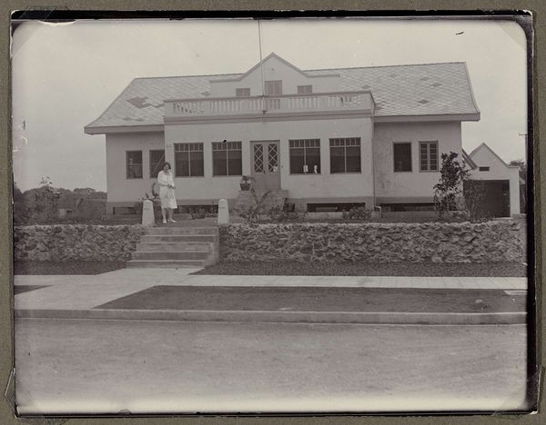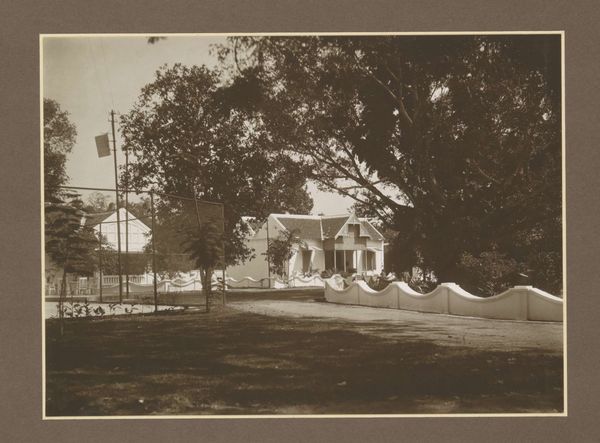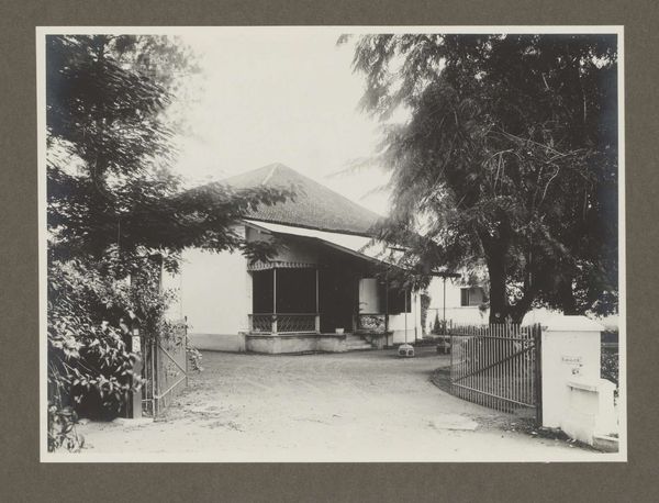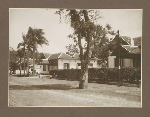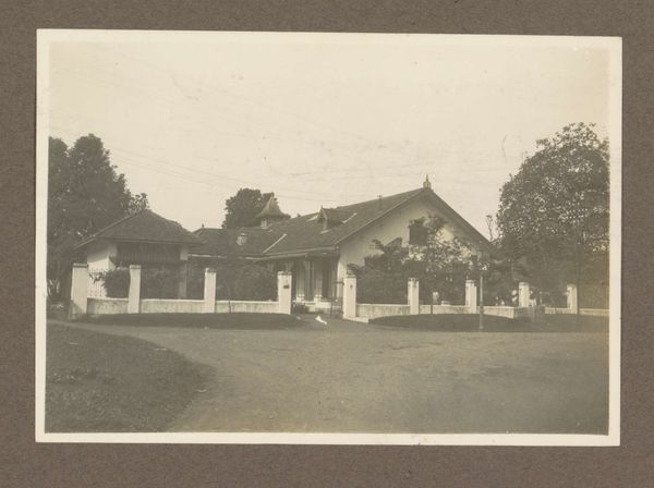 Curator: What strikes you first about this photograph? For me, it’s the light, giving the scene such crisp clarity. Editor: It feels very staged, actually. The placement of those rail tracks cutting across the foreground feels so deliberate. Are we meant to think about movement or progress? Curator: Let's delve into that further. This is an image titled "Woningen voor werknemers van suikerfabriek Meritjan te Kediri op Java," believed to have been created sometime between 1925 and 1930 by Isken. Editor: 'Workers' housing’ feels sanitized given the history. That manicured facade certainly conceals more than it reveals about labor relations. The very architecture, echoing a colonial style, is heavy with meaning. Curator: It's the construction that's fascinating. Look closely, you can almost see the hands that erected these buildings, the social context embedded within each brick. How the division of space manifests social hierarchies! Editor: You're right; I’m drawn now to the subtle geometry—the rooflines, the fence posts—everything is meticulously aligned. The contrasting textures – the smooth walls versus the wild foliage – contribute to the picture’s overall tension. Curator: Precisely! Consider how these visual elements reinforced notions of order and control prevalent during the colonial period, ideas perpetuated through the very materials used. What’s constructed, by whom, for what reason? That is the heart of it, no? Editor: I concede, you’re spot on! The composition now whispers rather shouts colonial control and its attendant labor arrangements! Curator: Understanding its visual rhetoric alongside its making transforms our reading experience entirely! Editor: Indeed! It's a sobering picture that requires attentive viewing to understand the relationships of power inherent within its materials and visual presentation. Curator: Right! So much for just a 'crisp' day captured. Editor: Understated... but very, very powerful.