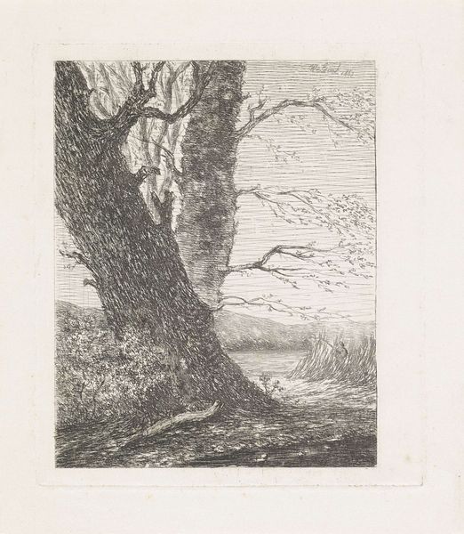 Curator: Welcome to the Rijksmuseum. Today, we're observing "Two Deer by a Pine Tree." The piece is attributed to Dirk Arnoldus Tavenraat, and its production date lies somewhere between 1855 and 1930. It's an etching. Editor: It's sparse, isn't it? Makes you feel like you're standing on a windswept hill under a bleak sky. Very minimal, but the textures in the tree are compelling. Curator: Interesting you say that, considering the possible range of years when this was made. This etching participates in the Romantic movement's revival of landscape, doesn’t it? Tavenraat is consciously pulling from artistic traditions of the past, placing animals in relationship with nature, which speaks to a cultural nostalgia for a rural past, idealized or not. Editor: And the material qualities contribute to that mood. It looks almost like a personal sketchbook drawing – see the quick, light marks? It feels very immediate, focusing on the process of sketching a fleeting observation. I'm wondering about the kind of tools that would be employed to generate such a quick result – different grades of graphite and a soft paper. Curator: The proliferation of prints and etchings, especially of landscapes and animals, served a growing market of middle-class collectors. They are participating in a broader cultural narrative, a national pride if you will, where landscape played an important role. Consider where this work would have been displayed - most likely in someone's home, influencing tastes and the cultural meaning of such a work. Editor: Absolutely. And, in those homes, this little etching might also reflect an emerging interest in wilderness preservation... almost a precursor to modern environmentalism given that nature has long served industrial expansion. But seeing the textures of nature preserved with accessible materials... that strikes me as deeply relevant. Curator: Precisely! An accessible landscape, and the popularization of it, created a certain kind of consciousness, a new vision. Editor: Well, this has really made me rethink the political potential embedded within an image as seemingly simple as this one! Curator: Me too. Etchings, seemingly innocuous, become active participants in the cultural narratives we inherit.