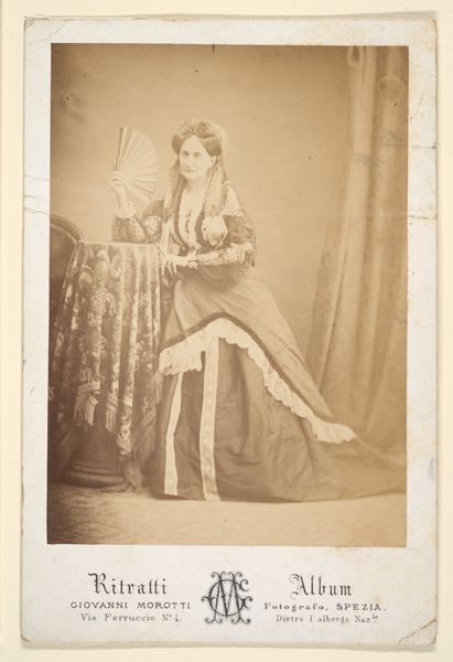Curator: Looking at this, I can’t help but imagine I'm stepping back into a lavish drawing-room, the air thick with perfume. Editor: That's certainly the impression it gives. This is a portrait of Costigliole by Pierre-Louis Pierson, dating from the 1860s, part of our photography collection. And your immediate take is...luxury? Curator: Oh, undeniably. The ruffles! The pose, so deliberately nonchalant... But there’s also a melancholy air. She looks almost trapped, or perhaps just…bored? Is it the angle of her gaze? Editor: Interesting observation, especially within the context of Second Empire Paris. Photography studios became highly commercialized. It was a way for the rising bourgeoisie and aristocracy to visually affirm their status and emulate fashionable trends and even royalty, given Pierson’s close association with the court. Curator: I see it now, like a stage play... Every prop carefully arranged. Yet that hint of melancholy almost feels subversive. Was she making a commentary or am I overthinking it? Editor: These photographic portraits, while seemingly straightforward, offer a complex intersection of private and public identities, the performance of self under societal expectations. Consider the circulation of these images, accessible as keepsakes, cartes de visite. Status isn't merely displayed; it’s made portable, democratized, in a sense. Curator: It is an oddity. You know, in its subtle shadows, it actually reminds me of some paintings from that time! All the tiny folds of fabric. Editor: The connection to painting is not accidental. Pictorialism, which heavily influenced photographers of the time, sought to elevate photography as an art form on par with painting, so we do see a deliberate manipulation of light and tonality that simulates painterly effects. Curator: A clever, sneaky ambition. I appreciate that duality here, how the constraints become part of its artistic expression. Editor: The constraints are indeed where the creativity flourishes! Well, thinking about Costigliole's subtle revolt, and how identity gets framed within very specific social needs really makes you question the role of a museum's authority to collect such stories, eh? Curator: Yes! Each era sees itself differently reflected in its own mirrors. A truly complex conversation emerges between past and present. Thank you.