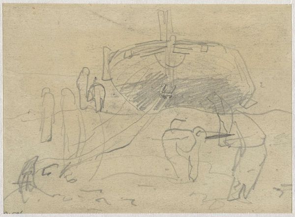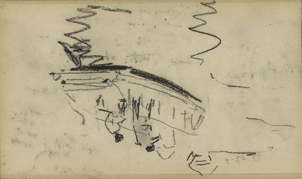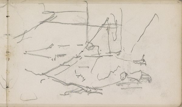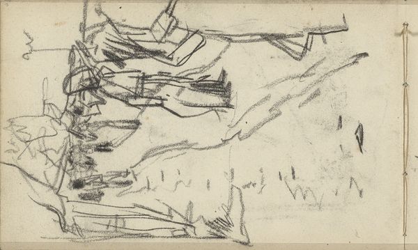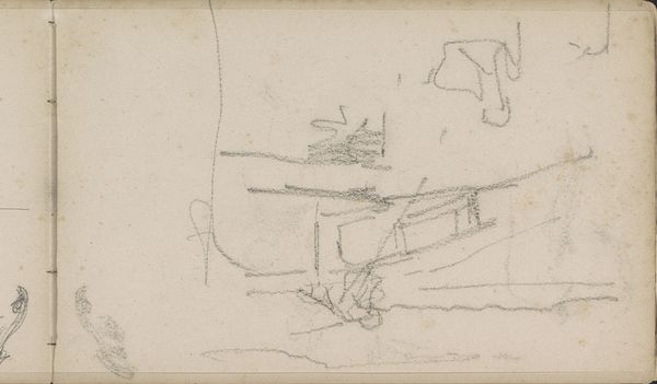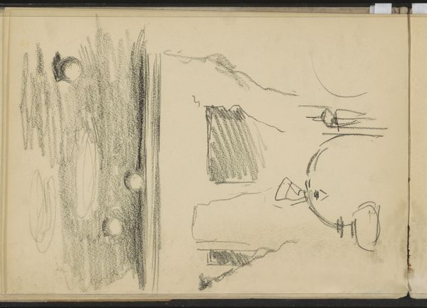 Curator: Looking at this evocative piece by George Hendrik Breitner, "Landscape with Farmhouse and Two Male Heads," created between 1881 and 1883. It’s currently held here at the Rijksmuseum. Editor: It's really quite raw, isn't it? Almost feels like a fleeting thought captured in graphite. There's a sparseness that conveys a sort of stark, quiet isolation. Curator: Exactly! Breitner's rapid pencil strokes hint at a working process, the quick, efficient capturing of a scene. I am drawn to how he used a simple pencil on paper; a relatively inexpensive medium accessible to many. Editor: Well, the choice of such readily available materials undoubtedly played into Breitner’s access. And consider the societal pressures, and how the Impressionists disrupted established hierarchies. It would allow for a broader accessibility to the art world than previously conceived. What can we infer from the fact it’s a landscape, as a common theme for example? Curator: True, but what impresses me more is how he extracts so much from so little. See the variation in the weight of the lines. In addition to the broad, expressive strokes of the landscape, you also have details such as the faint but discernable figures. Editor: Figures reduced to nearly abstract forms. It strikes me, however, the degree to which the art world and burgeoning gallery scene cultivated certain styles. Did such social-political influences permit more space for impressionist, on-location art, rather than polished studio creations? Curator: Definitely, although the Impressionists were responding to multiple shifts – social, technological with paint production advances, and economic conditions for a rising middle class. All this allowed for new art and subjects to exist and be bought. The sketchbook format contributes too to this sense of it being "real" life on the go. Editor: An unfinished state in many ways… reflecting a socio-cultural fascination with immediate sensory experiences and art’s new democratized function within society? But I do feel Breitner manages to show the mood of his time through minimal means. Curator: Indeed! The convergence of rapid urban development and interest in daily life of Dutch culture, it's all there in a humble pencil drawing. The sketch gives the sense of industry. Editor: A remarkable artifact. By considering the social climate that embraced Impressionism and a wider range of art, one may learn to understand better art. Curator: Yes, and that understanding becomes clearer when also appreciating the artistic intent, choices of materials, and skill brought together to render even a seemingly quick sketch impactful.
