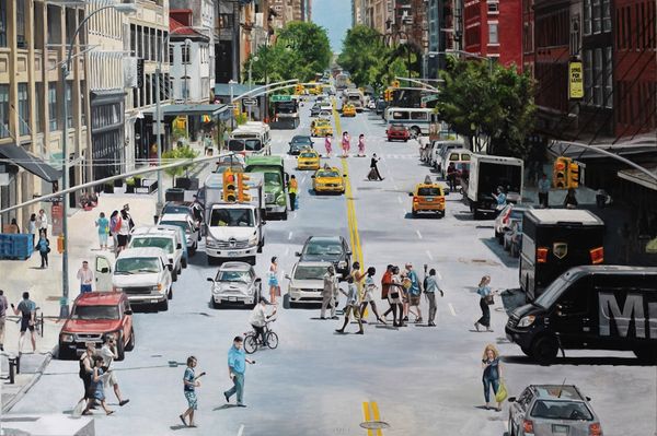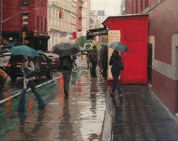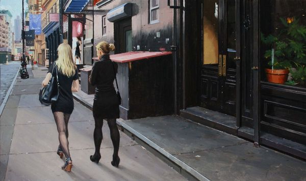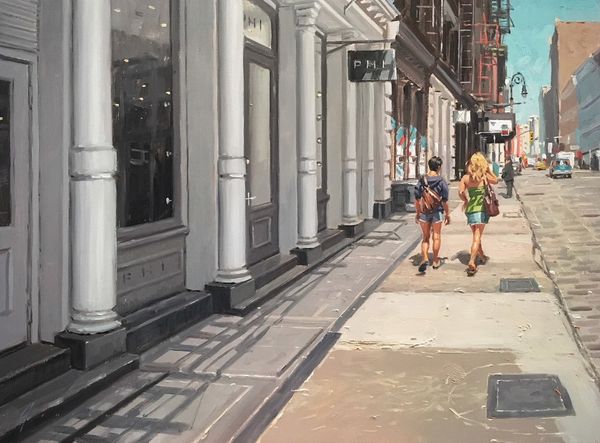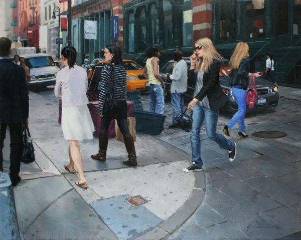 Vincent Giarrano painted 'On Stone Street' with traditional oil paints and brushes. Giarrano's masterful technique, with its subtle gradations of tone, evokes the feel of a city sidewalk – the way light reflects off the pavement, the grit and shadows of the urban environment. His realistic approach lends a sense of authenticity, highlighting the everyday drama of the city. The painting’s social context also reveals itself in the contrast between the figures: the suited woman carrying shopping bags versus the seated boy. Giarrano invites us to consider labor, class, and consumption. This work makes you wonder about the relationship between labor and consumption in contemporary society. By focusing on the materials and processes involved in the creation of this painting, we can see how it both reflects and comments on our shared urban experience.