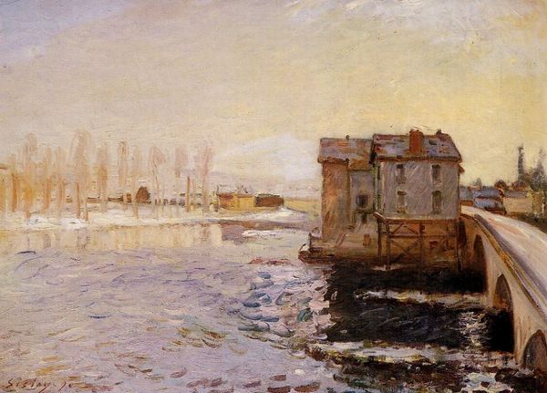 Curator: Today, we're looking at Claude Monet's "The Doges' Palace Seen from San Giorgio Maggiore 4," an oil on canvas he completed in 1908 during one of his visits to Venice. Editor: It's...hazy. Almost dreamlike. The light feels filtered, muted, and the colours seem to bleed into one another. I notice an emphasis on the building's reflections and their fragmented nature. Curator: Indeed, Monet was intensely interested in capturing the fleeting effects of light and atmosphere. Think about the physicality of oil paint here: strokes applied alla prima, blurring the forms. Notice that there are a few gondolas in the image. Editor: The Doge's Palace always struck me as a potent symbol of Venetian power and prestige. Monet reduces it here, though, blurring the symbols of the doge and softening the architecture to such an extent it seems like it is fading into memory. Even the surface of the water reflects this notion: not quite liquid, more like glass... still and brittle, and a thin veil hiding secrets beneath it. Curator: Good observation! What is more, this ties into the context of his work at the time. It shows his mastery in the Impressionistic approach. This involved rapidly applying small strokes to accurately and quickly catch the atmospheric nuances, it's about how industrialization shaped leisure. Editor: I wonder about Venice itself becoming this subject of myth... a city floating in time. Even the haze contributes to that feeling. There's a melancholy feeling and you have the symbol of authority gently reflected by an oily slick of polluted water. Monet understood. Curator: The work demonstrates Monet's obsession with recording reality through color and process. It really encapsulates the social values. Editor: For me, it's about Venice becoming this emblem, caught between glory and fragility. Thanks to symbols.