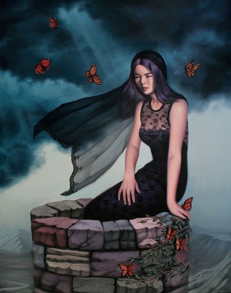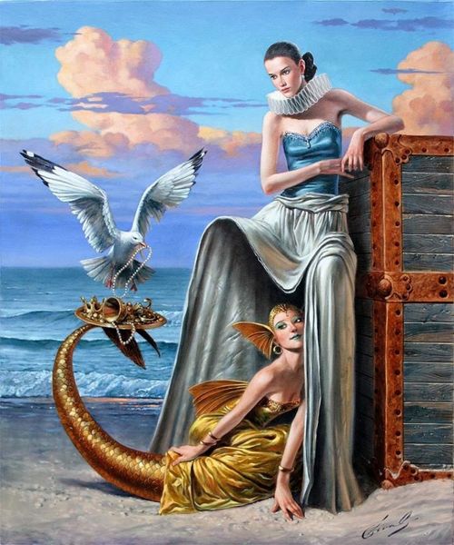 Curator: David Michael Bowers is the artist behind the oil painting we’re looking at, titled "The Crown". What are your initial thoughts? Editor: The first thing that strikes me is the almost staged contrast. There’s a theatrical element, certainly in the lighting and the posed figures, with a hint of surrealism, which unsettles the whole scene. Curator: Staged is a good descriptor. Considering that this is narrative art, let’s unpack that a little bit more. We see two women set within a sort of ambiguous landscape. One is seated, adorned with a crown of thorns. She's also holding a shovel and is rather demure in posture. The other figure is standing behind her, with an elevated aura to the other figure, but with more elevated footwear and attire. There seems to be a push and pull, if not outright conflict. What story might Bowers be telling here? Editor: For me, that “crown” speaks volumes, right? Immediately I’m thinking of religious iconography, specifically the Passion. The juxtaposition of her 'humble' attire with the modern red shoes makes the statement even more interesting. Curator: Absolutely. And those shoes offer an entry point to discuss power dynamics within the painting. The overt reference to religious themes is complicated by the 'everyday' look, as if this were a regular part of someone’s daily wear. We've certainly moved away from religious conservatism if this has become so mainstream, a new symbol of female identity and a comment about the status and value we now place on things. Editor: The other figure’s placement almost looming over the seated one. Is that dominance or concern? Is it protection? The whole painting is drenched in dualities – opulence versus austerity, freedom versus restraint... Curator: Well put! Perhaps Bowers uses these visual oppositions to ask us if true authority comes from within, versus from the privileges, finery, and elevated appearance? It becomes less a study about hierarchy, but perhaps a personal excavation. Editor: It all makes you wonder about who “The Crown” really belongs to in this composition and within contemporary life. An unsettling yet striking statement. Curator: Indeed. This work provides plenty to consider regarding modern values. Editor: A potent invitation for conversation, indeed.