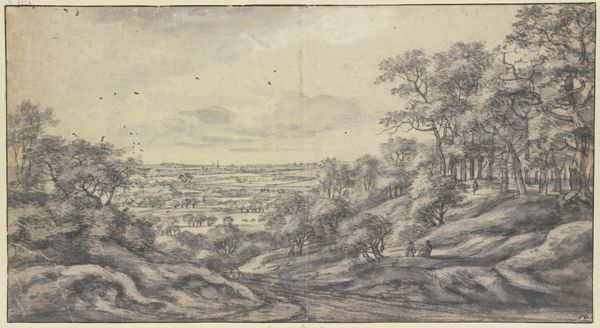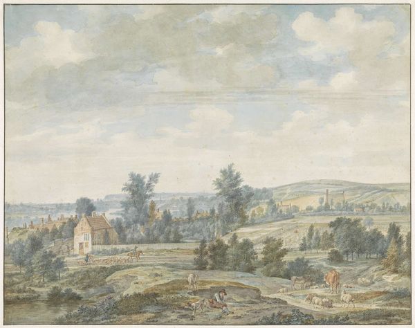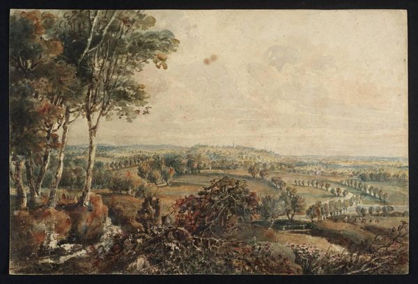 Curator: Before us is a scene by Jakob Bürgi titled "Landscape with the River Main." What feelings stir within you as you gaze upon this vista? Editor: It's undeniably serene, isn't it? There's this soft, almost muted palette that gives the entire scene a quality of peacefulness. A bit… wistful, perhaps? Curator: Indeed, the calmness permeates. And what about the ways it's crafted? It's quite clearly a painting; though some classify the piece as an oil painting or even watercolor, which would you consider to be the prevalent medium? Editor: Well, based on the detail, and that texture there around the edges, this piece really speaks of meticulous layering of colors—it would point me to oil painting as the primary material. I'm wondering about the support. Can we find any material provenance that can hint to why Bürgi chose what he chose? Was this intended for travel? Curator: The lack of precise dating means we’re adrift somewhat, however if the artist produced work on a commercial level—to reach an ever growing audience— that may well influence which processes, in regards to both labor and time, the painter uses to execute the work. Editor: That makes total sense; Bürgi wasn't just depicting a landscape, he was participating in the landscape market, in a sense. Each building a brushstroke of labor economics! Curator: I suppose so, even if my own vision for the landscape lies with other forms. It is impossible, when standing here to think about its implications from a certain vantage point, not to become emotional. For me it serves as a profound moment. Editor: Absolutely. Thinking about artmaking as labor brings another dimension. I think I understand the picture that much better. Curator: So then it offers a reflective note on nature's role for the self and society, in conjunction. It may not strike at once but there’s definitely a reason as to why the Main drew the eye and heart.