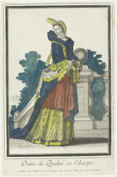 Curator: Oh, it's got that wonderfully wistful, slightly faded feeling. Like a half-remembered dream from childhood summers. Editor: Well, this piece titled "Jonge vrouw met vruchten en korenaren," or "Young Woman with Fruit and Ears of Wheat," dates back to around 1695-1697. It’s attributed to Pieter van den Berge and held here at the Rijksmuseum. Looking closely, we can see it’s a mix of engraving and ink on paper. Curator: Right, that’s what gives it that precise yet airy quality. She's standing there so serene, offering her summer bounty while a mischievous young boy tries to grab a treat. What do you notice about how it was made? Editor: For me, it’s fascinating to consider the printmaking process. Think about the skilled labor, the tools needed to create the engraving, the types of paper and ink used—every choice reflecting economic and social realities of the late 17th century. This wasn't just art; it was commerce. The act of printing multiplied images and reach. Curator: I see what you mean. I think about how someone meticulously etched that image into a plate. It is not exactly a portrait but the young lady offers all these fresh ingredients as if she wants to show them or she wants to share them. All this work only to create more joy. You know, for me the most interesting part is this figure representing Summer, holding both fruit and wheat! I almost hear that poem below... but in Dutch! Editor: Ah yes, the little verse about Summer’s gifts written at the bottom adds another dimension. To delve deeper, the composition is divided clearly in two sides: cultivated abundance, but also innocence and joy in reaching out for what is available to be taken. Curator: Looking at the work in its entirely, I can not escape thinking on nostalgia, it makes me want to return to these places by the water in which time stands still, where someone once drew us on paper with delicacy. Editor: Thinking of all that physical work of printing, maybe it can be done again, digitally, nowadays, or it can only last forever by standing behind a crystal showcase?