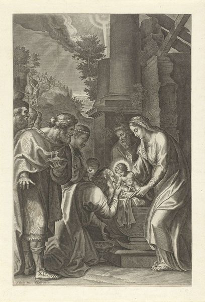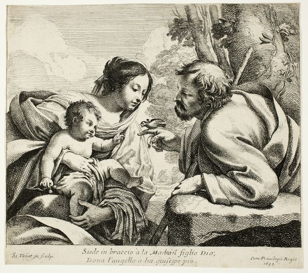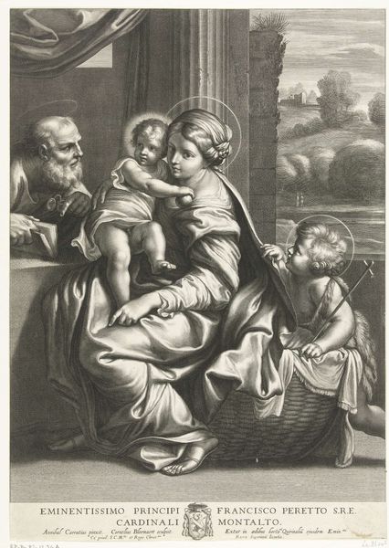 Ludwig von Siegen created this print of The Holy Family with John the Baptist sometime in the mid-17th century. It presents a scene of domestic intimacy: the Virgin Mary, the infant Jesus, Joseph, and the young John. Prints like these played a crucial role in disseminating religious imagery across Europe. Consider the institutional context: the Catholic Church, still reeling from the Reformation, relied on art to reaffirm its doctrines and inspire piety. Von Siegen, working in the German territories, would have been acutely aware of the religious tensions of his time. Look at the way the artist employs techniques of light and shadow, reminiscent of Italian masters, to create a sense of drama and emotional depth. The print isn't just a devotional image; it's a carefully constructed piece of religious propaganda. To fully appreciate this work, one might consult theological treatises, social histories of family life, and the records of printmaking workshops. The meaning of art lies in this complex web of social and institutional forces.