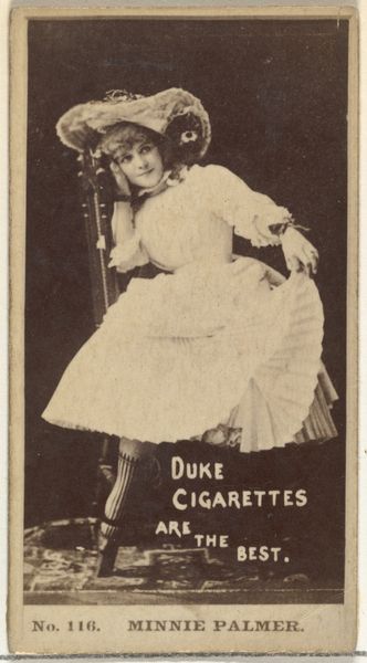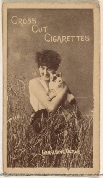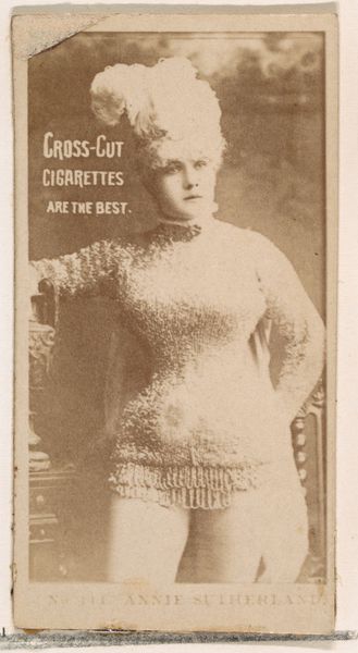 Curator: Let's take a look at this trade card from the 1880s by W. Duke, Sons & Co., specifically Card Number 149 in the Actors and Actresses series. It was created as advertising for Cross Cut Cigarettes. The titular figure in this print is Annie Robe. Editor: There's such a stillness to this portrait! I can't help but feel the melancholic beauty of the woman’s bowed head. It gives a dreamy feel, yet there's something subtly alluring, maybe seductive about it as well. Curator: Indeed. These cards, often employing photographic or etched portraiture, were strategically included in cigarette packs. They operated within a burgeoning culture of mass consumption, effectively turning actors like Annie Robe into commodities themselves, objects of desire linked inextricably with tobacco. The commercial act of smoking becomes tied to glamour, luxury, and aspirational identity. Editor: Absolutely. Thinking about the actress in this trade card makes me feel she's somewhat entrapped by this world, gazing out—or, perhaps, inward—and there’s such subtle defiance on display with her hands clasped right on top of the advertising as if she were silencing that voice that tries to commodify her beauty! Curator: This also suggests how photography and printing enabled the proliferation of celebrity images. The card served a dual purpose: it promoted the product and it simultaneously democratized access to the faces of prominent entertainers, contributing to early formations of celebrity culture and fandom. Editor: It's interesting to observe how this simple little rectangle of advertising does much more than promote cigarettes; it captures this pivotal shift when celebrity became a sellable commodity, a fragmentable thing reproducible on cardstock and collectible with a strange sort of intimacy, all under the veneer of consumerism. Curator: It underscores that the "best" was not just the cigarette, but also the fantasy peddled alongside it. Thank you. Editor: Thank you. An exquisite meditation on consumerism!