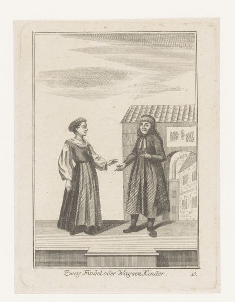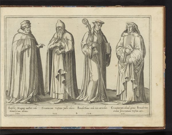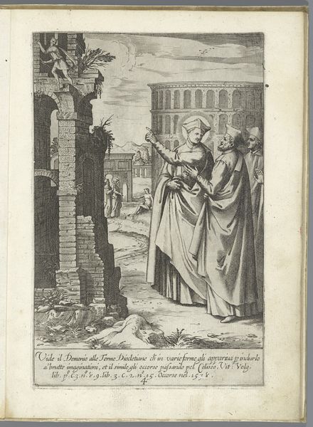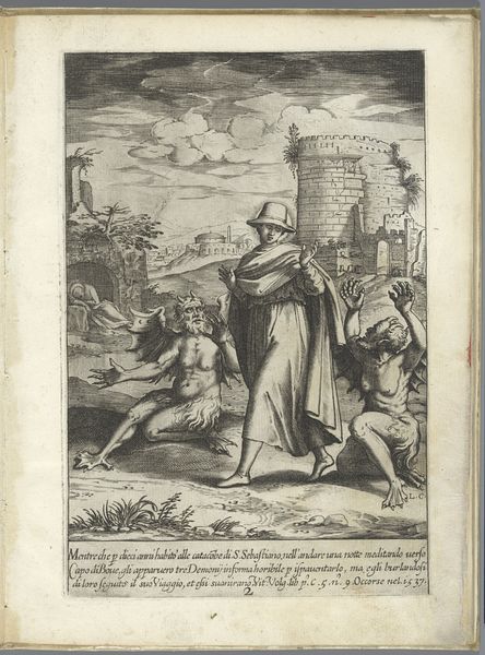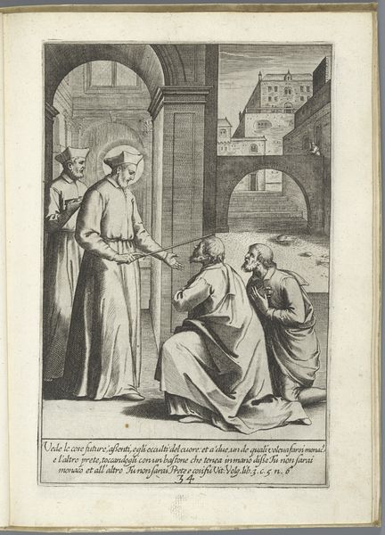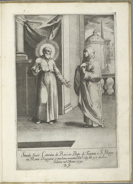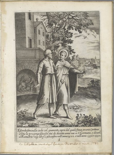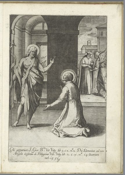 Curator: This engraving by Luca Ciamberlano, dating from 1630 to 1641, is titled "Filippo Neri moet in Rome blijven," or "Filippo Neri must stay in Rome." It's part of the Rijksmuseum's collection. Editor: The tonal range creates a very solemn atmosphere. I’m immediately drawn to the figure on the left, emanating a divine presence amidst earthly duties. Curator: Indeed. This work situates us within a specific moment in the Counter-Reformation, specifically highlighting Filippo Neri's role and position within religious expansion efforts in Rome. The engraving portrays Saint Filippo Neri with another monastic figure, referencing the claim by Agostino Ghettini, a monk, who indicated that John the Evangelist requested to him that the expansion efforts of India were needed more so in Rome. Editor: It’s intriguing how Ciamberlano uses symbolic language. A building rises behind Filippo. Why does he loom so large? Also, a angel is above people. Curator: Well, the angel holding an individual has historical context. This reflects the iconography around John the Evangelist, and here the engraver likely chose it to reinforce the idea of evangelization and the call to missionary work. The city rises on the hill behind him to reinforce this point. Editor: It seems interesting, though, to include a halo-ed saint talking to a more earthbound monk. It seems a little heavy-handed in trying to impress on the audience that this revelation is legitimate. The artist could have made the statement of authority differently. Curator: However, by situating them so prominently, side-by-side, but at the precipice of buildings, there's an indication of balance and direction that they can take as both parties understand the implication. Perhaps Ciamberlano challenges the concept of religious order with a statement of individual experience. Editor: Interesting take. Thinking about this symbolically reveals just how much of religious narratives depend on shared visual culture to lend legitimacy and impact. Curator: Agreed, the impact of these types of cultural references can speak to different levels of commitment in how it can play with individual understandings of cultural narratives. Editor: Yes, by considering the socio-political contexts, we expose the intersection of historical movements on cultural memory.