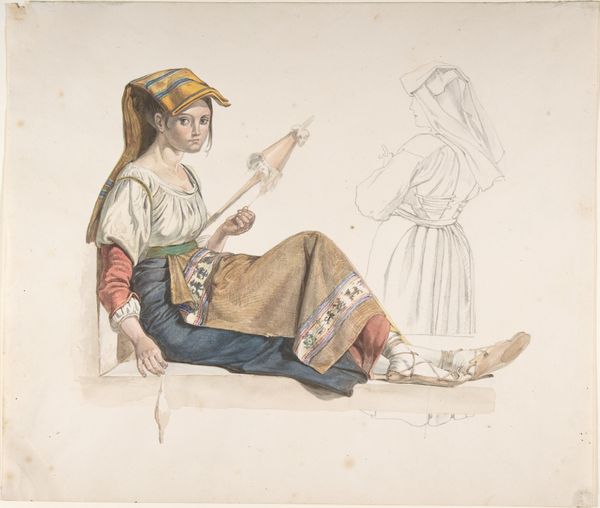 Curator: This is Adolph Tidemand's watercolour from 1849, "Aagot Knutsdatter Mykin og Astrid Knutsdatter Hell." Editor: Well, that just sings of a quiet dignity, doesn't it? Two profiles side by side. Austere, but those bursts of colour in their scarves! It’s almost a whisper of defiance against the grey wash. Curator: Indeed. These are genre portraits, studies in traditional Norwegian costume. Notice how Tidemand has used watercolour, typically considered a craft medium, to capture the nuanced social identities of these women through the detailed rendering of their clothing. Editor: Craft, high art – who decides? These garments aren’t just cloth, are they? I imagine them whispering stories of long hours of needlework, each stitch a tiny act of preservation. Generations of hands, creating these intricate designs. I bet it would take forever to master the techniques. Curator: Precisely. The labour embedded in these textiles becomes a critical component of the artwork. The visible pencil sketches underneath the watercolor reveal his artistic process. These aren’t just idealized images; Tidemand is grounding them in material reality. These textiles represent work. Consider their value and cultural impact during that time. Editor: Material reality… and something more. Look closely – especially at Astrid on the right, almost lost in thought. The faint hint of a smile on her lips and the details in that flower in her scarf almost feel… defiant. Almost as though she is rejecting a male gaze through artistic observation. It speaks volumes about the untold stories these clothes carry with them. A soft revolt stitched in time. Curator: It certainly challenges a straightforward reading. The consumption of such imagery amongst an urban elite arguably relied upon a romanticized distance from rural lives even while depending on the very material products of their labour. Editor: Perhaps, but those floral details hint at secret gardens. Maybe that's my romantic heart speaking! Though after diving into this with you I feel like their simple poses, so directly presented to us, allows our mind to make these deeper observations on what their lives would have entailed. Curator: Agreed. Tidemand’s choice of watercolour brings to the forefront questions of value, artistic skill, and the representation of social identity through material culture. Editor: And the human soul that flickers beneath! I see now. It's more than just a pretty picture and some costumes - its also that inner life peeking out. Fascinating, truly.