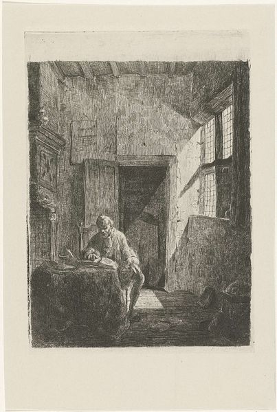 Editor: This is "Vrouw met twee slapende kinderen wachtend bij een open raam," from 1856, by Willem Linnig. It's done with ink and pencil, depicting a woman with her children indoors. The mood feels heavy, expectant, maybe even a bit somber. What catches your eye when you look at this drawing? Curator: What I immediately notice is the visible labor embedded in the image itself. Consider the rough-hewn wood of the beams, the handmade quality of the window panes. These aren’t mass-produced materials. They speak to the artist's deliberate focus on the raw materials that shape everyday life, don’t they? And by extension, to the societal systems around material production and labor that contextualize it. How does Linnig highlight the circumstances of labor and production in this scene? Editor: That's interesting, I hadn't considered the window itself! It draws my attention to how the process of making something functional can still be beautiful, like the intricate patterns of the window. Curator: Exactly! And what about the labor of motherhood implied? A woman pauses, maybe from housework, and the weight of domestic life, with those children so physically attached. Consider the material realities for women then – expectations, constraints. Think about the production of drawings like this too: Who was the intended audience, and what commentary does it make regarding their societal status? Editor: It almost feels like Linnig is trying to show the true picture, focusing less on the grandeur and more on everyday material life and the physical and emotional toll it has on individuals. It does invite some thought about the accessibility to art itself during this time period, and it’s possible audience. Thanks for broadening my view. Curator: And thanks to you as well, it’s good to refocus on art as it embodies lived experiences and also to think through the lenses of materials and production processes!