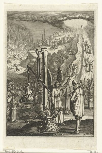 Editor: This intricate engraving, titled "Embleem met de mens die zijn kruis draagt en zich bewust is van tegenslagen op zijn weg," roughly translates to "Emblem with the man bearing his cross, aware of adversities on his path." Created between 1620 and 1623 by an anonymous artist, it’s currently housed in the Rijksmuseum. The mood is quite somber. All these figures hauling crosses… What do you make of this, seeing it now? Curator: Ah, yes, a visual symphony of struggle! Imagine yourself transported to the early 17th century. This print isn’t just a pretty picture; it's a moral compass, a guide through life's inevitable hardships. Each figure trudging along with their cross represents humanity burdened by its earthly woes. Editor: I see that, the figures are struggling a lot with what seem to be heavy crosses, there are others in hell! But why so many? Curator: Precisely! It’s the "everyman" struggling with adversity. The ladder is showing possible paths but it ends in a place that is pretty scary with evil birds flying around. That top part contrasts beautifully with the chaos below, doesn’t it? With that heavenly reward being granted to those who climb closer. A light, even if not obvious! The anonymous artist captured something pretty eternal. What does it tell you about our fears? Editor: That our struggles will amount to something better in the afterlife? It reminds me that our life is to try to be better. That feels so heavy to deal with. Curator: The Baroque artists are fantastic to elicit an emotional reaction. Editor: They sure do! Seeing this all laid out has really put things into perspective. There's a strange comfort in knowing everyone’s got their own cross to bear, metaphorically speaking of course. Curator: Indeed, a cross-generational tale etched in lines. Each time you view this, you'll see a different shade of truth reflected in its mirrored sorrows and triumphs.