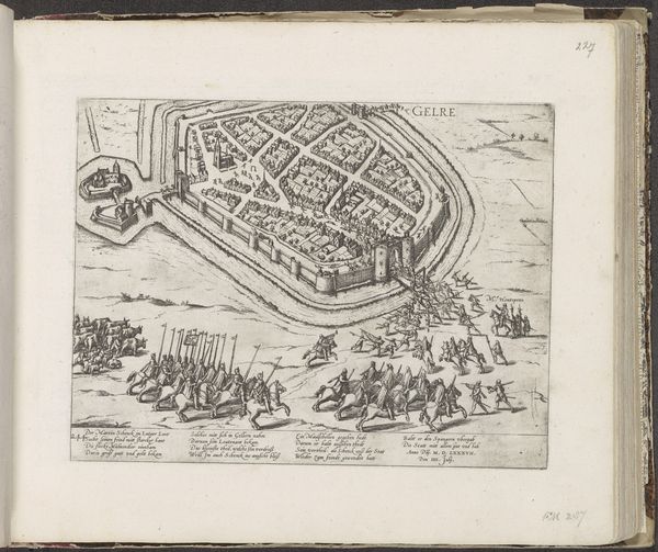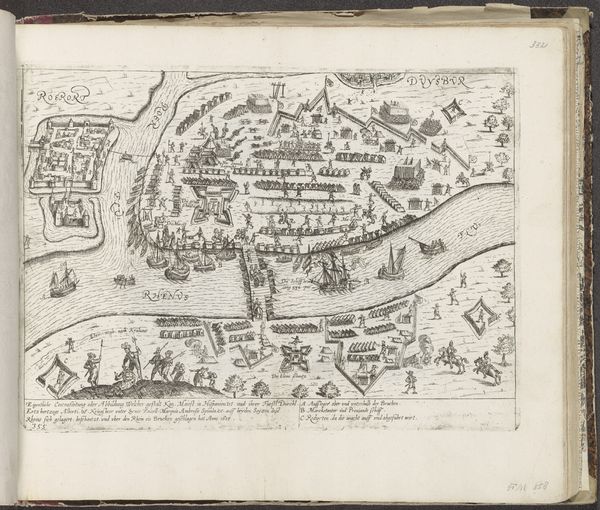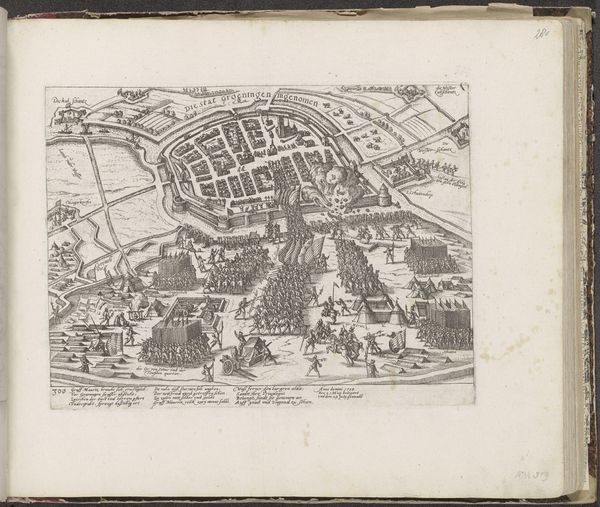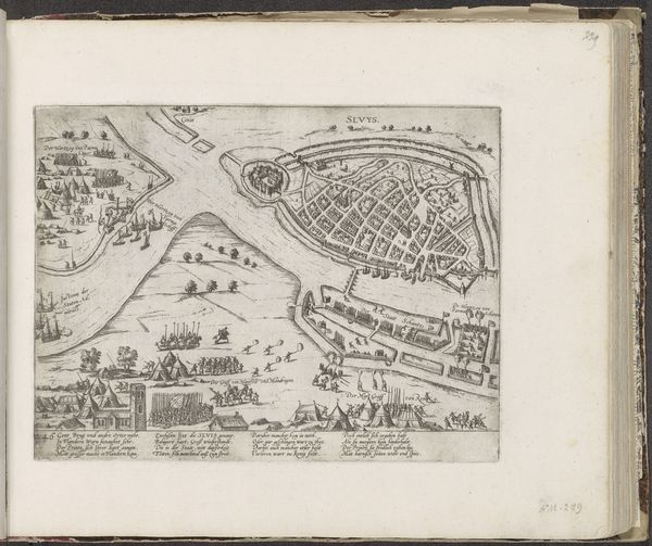 This print, titled "Inname van Aalst door de Spanjaarden, 1576," was created by Frans Hogenberg. The composition is dominated by a bird's-eye view of Aalst, encircled by a river and fortifications. The layout offers a structured representation of urban space. Hogenberg employs a meticulous approach to detail. The dense arrangement of buildings, rendered with fine lines, creates a textured surface. The orderly disposition of troops and the geometric precision of the fortifications reflect a desire to impose order. The print employs a symbolic language typical of its time, where spatial relationships and visual elements were used to convey power dynamics and historical narratives. The representation of the Spanish conquest as an ordered, almost clinical operation subtly reinforces the invader’s control. This formal structure is not merely aesthetic; it's a visual encoding of political ideology.