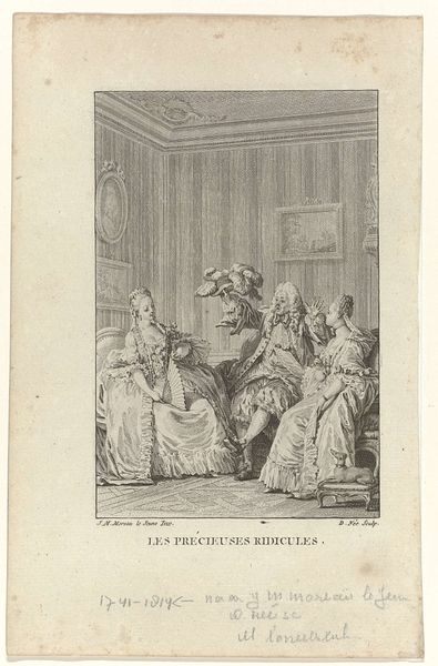 This print, "Twee jongens bij hun moeder in een vertrek", was created by Reinier Vinkeles. The scene presents a classical composition, balanced and symmetrical, with a domestic interior framed by architectural elements. The figures are meticulously rendered, emphasizing line and form over color. Note how the varying densities of line, from the delicate strokes defining the faces to the denser cross-hatching that models the clothing, create a sense of depth and texture. The subjects appear frozen, their gestures carefully posed to convey the narrative, perhaps an allegorical representation of familial virtue. The underlying structure of the scene – the arrangement of figures, the play of light and shadow – reveals an engagement with Enlightenment ideals, echoing the period’s emphasis on order and reason. Yet, the subtle emotional tension hints at the complexities beneath the surface. Observe the formal qualities, the controlled use of line and the balanced composition, because these provide a lens through which to understand broader cultural and philosophical concerns.