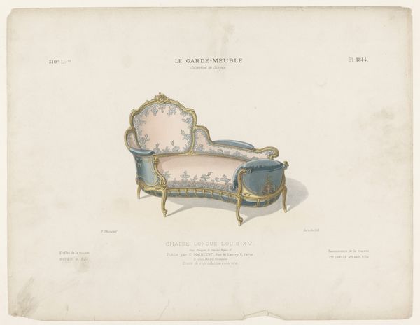Curator: Here we have a print titled "Canapé" dating roughly between 1895 and 1935. Editor: It’s delicate, isn’t it? A restrained use of color… It almost feels like a technical drawing rather than something purely decorative. Curator: It certainly bridges a gap. It's printed on paper and incorporates drawing techniques. Given the title mentions “Louis XV,” we’re likely looking at a historical record or an interpretation of a settee from that era, reproduced for a later audience. The very existence of 'Le Garde-Meuble' suggests an intent to document furniture designs and possibly offer them for reproduction. Editor: Exactly. Think of the labor involved – the artisanal skill in rendering such fine details for print reproduction. It speaks to a particular form of consumption. Someone, somewhere, would see this and aspire to have it replicated or perhaps commission something similar. This image is part of the chain of production. Curator: Precisely. And the publication details further contextualize its role in the design marketplace of the late 19th and early 20th centuries. These details offer valuable insights into the broader historical context. This was not just art, it was business. Editor: A business intertwined with cultural aspirations. That floral design is certainly not accidental; even then, the fabric and woodwork spoke to a social class and the culture it wanted to reflect, literally furnishing their space, and, more broadly, their image. Curator: An image carefully cultivated and meticulously reproduced. This piece is not only an aesthetic object, it embodies economic and social relationships of its time. Editor: A blueprint for both a canapé and a certain echelon of society. Curator: Quite. This work reminds us of the art and the object in service of cultural power. Editor: And it subtly unveils the production of desires and class aspiration, made through the very work of the draughtsman's labor.
