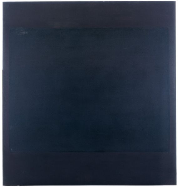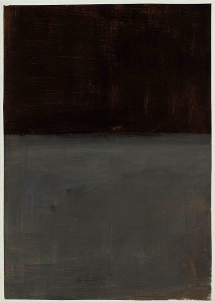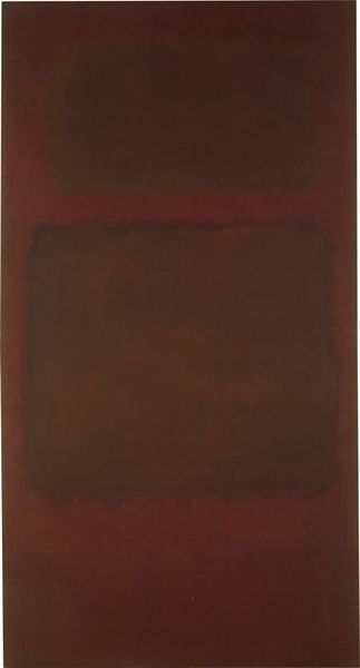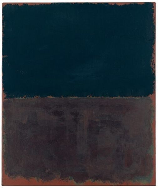 Curator: Standing before us is an untitled painting by Mark Rothko from 1968, crafted with oil on canvas. What's your immediate reaction to it? Editor: It feels intensely somber. The two dark, almost maroon rectangles stacked on top of each other... it's like looking into a void. There’s a weighty quality to it. Curator: Rothko's work often aims to evoke precisely that kind of emotional response. Thinking about it in the context of 1968, a year of immense social and political upheaval, does that mood resonate any differently? Editor: Absolutely. You can't divorce it from that time. The Vietnam War was raging, there were civil rights protests and assassinations… It’s hard not to see this darkness as a reflection of that collective despair, that sense of societal unraveling. And look closely at the edges: those soft, feathered boundaries between the blocks and the ground. It suggests a vulnerability, like the whole thing could dissolve. Curator: Rothko meticulously layered the oil paint, diluting it to achieve that luminosity and blurring you pointed out. He was very particular about how his paintings were lit and viewed, ensuring an immersive experience. The surface texture itself invites close inspection, a slow reveal of how it came into being. Editor: That reminds me of how some theorists discussed the psychological impact of consumer culture during that period – that the blurring of boundaries, the dissolving of distinctions between real and unreal, mirrored the anxiety of mass production. How it flattened individual expression under homogenous forms. Rothko using the grid as a method for abstraction counters any perceived mass production with an assertion of internal creative labor, don't you think? Curator: It's a fitting argument to consider that abstraction can be very human as an affirmation of the artist labor. Editor: Ultimately, despite its somber tones, this artwork speaks to the complex socio-political climate of its time. There are profound emotional resonances that are hard to ignore and impossible to look away from. Curator: Exactly, and by considering its materiality and construction, we reveal new possibilities and an invitation to engage intimately with its artistic process. A rich and multilayered experience.
