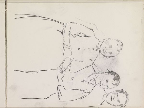 Editor: This piece, "To skikkelser," or "Two Figures," by Robert Storm Petersen, dating from around 1909-1910, is rendered in pastel, watercolor and drawing. It feels both intimate and somewhat unfinished, like a fleeting sketch. The earthy tones give it a raw quality. How do you interpret the relationship between these figures? Curator: I see this work as speaking to the evolving attitudes toward the nude in the early 20th century and it may allude to both societal fascination and discomfort. Petersen places the female nude at the forefront, partly concealing another figure, challenging the traditional power dynamics inherent in portraying the female form for a predominantly male gaze. Editor: That's a fascinating take! I hadn’t considered it in light of those power dynamics. The male figure does seem rather…recessive. Do you think the choice of medium - pastel and watercolor - contributes to that impression? Curator: Absolutely. The fluid and somewhat ephemeral nature of watercolor and pastel aligns with a shift in how artists like Petersen approached representation. Compared to the more academic, polished styles favored previously, these mediums lend themselves to capturing a fleeting moment or a raw emotional state. Also consider the burgeoning museum culture and art market of the time. What role might these factors play in Petersen's decision to create a work like this? Editor: Hmm, maybe Petersen aimed to create something that was both accessible and challenging to the conventional art establishment? It makes you wonder how audiences at the time received it. I've definitely learned a lot about how context shapes art. Curator: Precisely! Considering the historical and social background reveals layers of meaning in even seemingly simple works. It invites us to think critically about the politics of imagery and how artists like Petersen negotiated the public role of art.