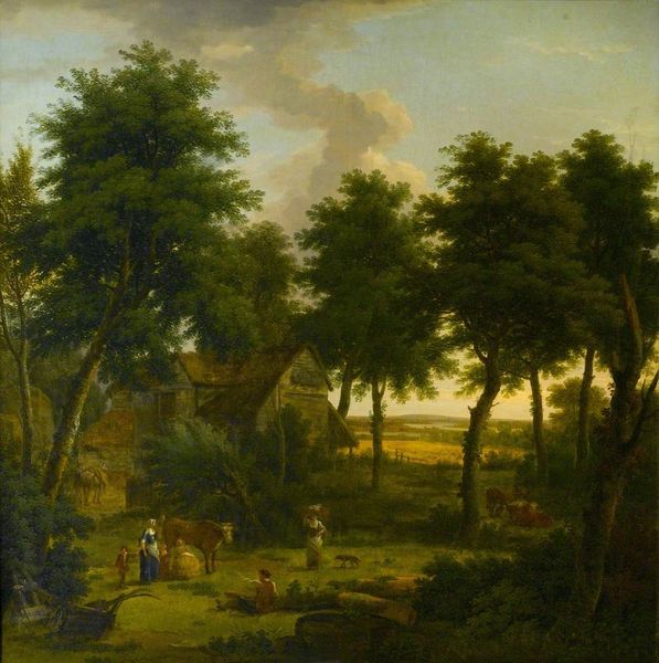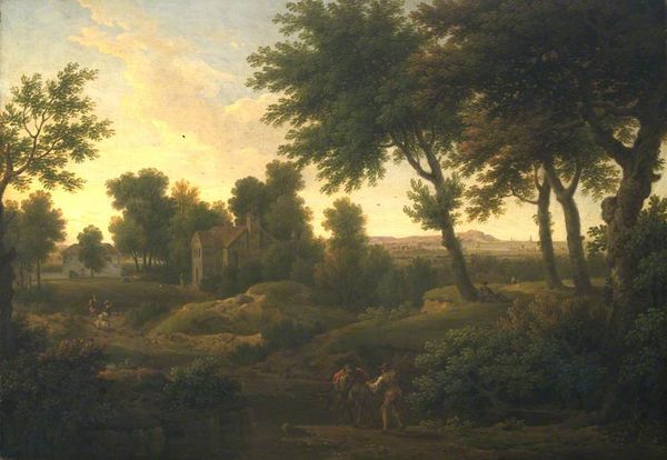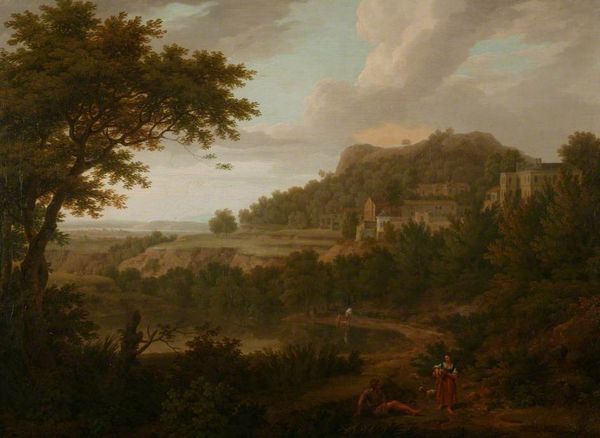 George Lambert painted this "View of Copped Hall in Essex, from the Park" sometime before 1765. Dominating the horizon, the architecture of Copped Hall speaks of man's dominion over nature. The building, solid and geometric, stands in contrast to the wildness surrounding it. Look at how the trees frame the scene, their branches reaching like arms—an ancient motif seen as far back as the murals of Pompeii, where nature was often depicted as both a refuge and a reminder of mortality. The figures in the foreground, enjoying a leisurely picnic, are participating in a pastoral ideal. However, this image is not just a peaceful scene. It represents a carefully constructed view of landed gentry. The Hall itself, a symbol of power and wealth, overlooks the landscape, much like a watchful eye. This compositional choice connects the painting to a long tradition of landscape art, where the land is not just scenery but also a statement of ownership and control. These symbols aren't static; they evolve. The pastoral scene, while seemingly timeless, carries the weight of historical context. The image of leisure and harmony can also suggest an unconscious desire for an idyllic past. Through art, the past continually resurfaces, transformed but never truly gone.