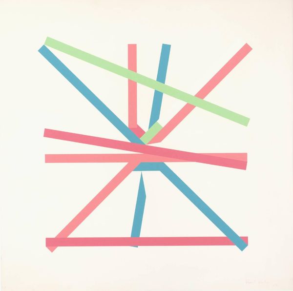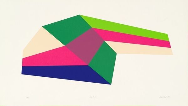 Curator: Here we have "Barcelona," a 1969 print by Paul Reed. It is a bold geometric abstraction. Editor: My first thought is how clean the edges are, the pure shapes give it a real visual pop! It is visually arresting in the way it plays with dimension. Curator: The work is strongly influenced by movements such as Op Art, Pop Art, and Color Field painting which were all hugely interested in color theory and surface effects. The "hard edge" quality is worth noting too – so deliberate! Editor: Absolutely. It’s fascinating to think about the process involved in achieving such precision, particularly the labour necessary in this pre-digital age. We need to consider this in the context of mass production and consumption happening around the time. Was Reed commenting on this culture? Curator: That's a rich idea. I think about its relationship to Color Field specifically - where you get large scale abstraction. With this work we see an abandonment of overtly representational painting. There's no attempt to create illusionistic space here, but to instead to call attention to its constructed-ness. Editor: Yet it feels strangely hopeful. The shapes lock and interlock and I'm trying to work out how to interpret that interplay. Curator: Well, the title "Barcelona" certainly suggests a specific geographic location, yet what aspects of the city are reflected in the abstraction? It avoids explicit political statements that Pop Art was occasionally known for, choosing an aesthetic vocabulary that has broad visual appeal. The work emphasizes visual perception itself. Editor: Perhaps that interplay of shape and colour provides space for an open interpretation: how does the art meet its viewers? What social function is being proposed here? Curator: It definitely requires us to slow down and consider our own role in bringing meaning to the artwork, as viewers, but also as consumers. Editor: "Barcelona" encourages us to confront how constructed realities shape us. Curator: Precisely – a compelling point, as the artist directs our attention not only to the flat surface but to social spaces too.