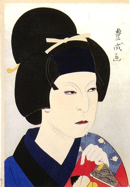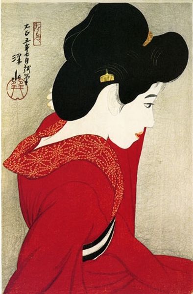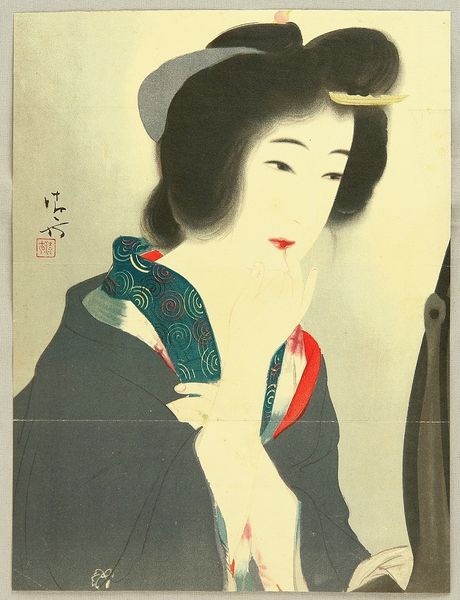 Editor: Here we have Yamamura Toyonari's woodblock print from 1922, titled "Sawamura Sonosuke I as Umegawa". The flat blocks of color are striking, but there’s something melancholy in the actor’s gaze. What symbols and meanings are layered in this portrait? Curator: The actor print, or *yakusha-e*, often acted as a form of celebrity portraiture in its day. It memorializes not just the person but a specific role. Umegawa, traditionally portrayed, is laden with codified signs of suffering and virtue. Do you see them? Editor: I notice the controlled lines, the simplified forms – almost like a mask. The averted gaze seems so calculated. Is it a commentary on the performance of emotion? Curator: Precisely! Ukiyo-e, this floating world, is a space where illusion and reality intertwine. Note the color choices. The controlled palette with the stark black hair, and the muted tones contribute to a restrained, yet dramatic effect. This deliberate stylization highlights the tension between the actor's true self and the persona they embody. It invites reflection on the weight of performance and the power of the image to shape perception. The flat perspective in ukiyo-e directs your gaze. What do you see, in the lower portion, close to the robe's trim? Editor: It's hard to make out - almost looks like an abstract doodle, but perhaps is actually significant. What could be suggested there? Curator: These minute details are meant to subtly comment on some aspect of the play and provide information. Like memory, iconography functions with fragments, the unsaid given equal, and even more significance. Editor: That’s fascinating – thinking of symbols as fragments of a larger cultural memory. This print really pushes beyond a simple portrait. Curator: Indeed, it becomes a mirror reflecting not only the actor's face but also the complex cultural landscape in which they perform.
