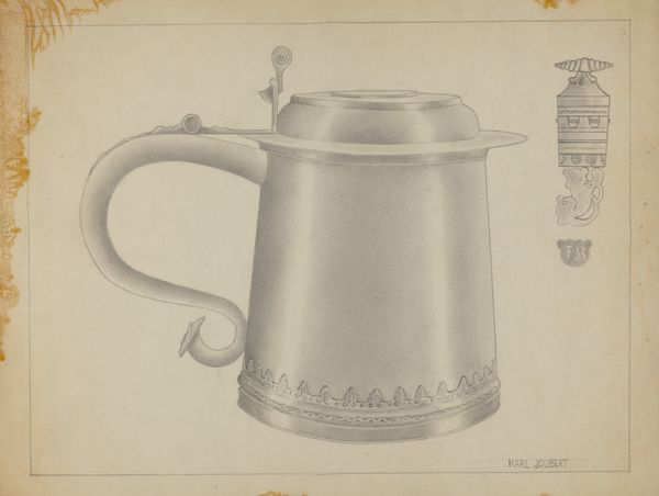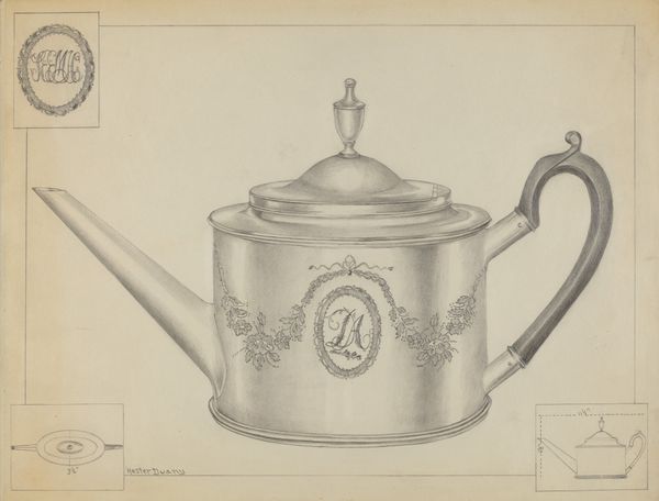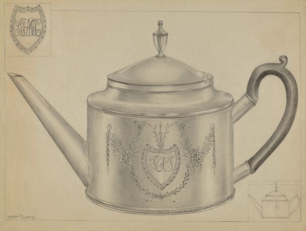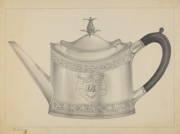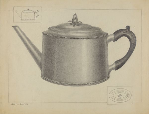 Curator: This is Giacinto Capelli's "Silver Teapot," created around 1936. He rendered it meticulously in pencil. Editor: It's lovely—so unassuming, but the precision creates a quiet intensity. Almost hyperreal, even though it’s just pencil on paper. Curator: Capelli was working in a period fascinated by domestic objects, often elevating them to symbols of order and bourgeois stability, particularly during interwar Europe. Editor: You can really see the hand at work here. The subtle variations in shading, how the pencil reflects light differently depending on the angle, emphasizes materiality and craftsmanship over the object’s functional purpose. Was Capelli interested in commercial applications of his draughtsmanship? Curator: His primary focus was realism and capturing the effects of light, showcasing mastery of his technique, especially working during an era with increasing debates around art’s role and artistic institutions in a time of social upheaval. Editor: Right, there is the silver, the specific use of that metal in the handle—it all implies social stratification of labor, a specific class elevation that can seem very remote. But looking closely at the rendering—so subtle in tone—this feels less about showing and more about careful seeing. Curator: Do you mean a critique of the culture and conditions through subtle observations? It would tie in with other realist explorations in the interwar era where still life gained attention because it stood apart from increasingly monumental sculptures made for propagandist reasons. Editor: Exactly! Capelli transformed an everyday object into something that encourages us to see beyond its surface, pushing beyond what is expected to convey meaning, focusing on labor through precision. I notice how he made it by hand with readily available, cheap materials. This drawing speaks volumes. Curator: I agree. It speaks quietly, like the drawing room conversation where this teapot may once have been present. Editor: Exactly, transforming our gaze and perspective. It is fascinating how simple acts can encourage careful observations.