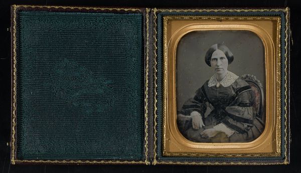 This daguerreotype by William Shew captures a portrait in the mid-19th century, encased with what appears to be a maple leaf. The maple leaf, beyond its botanical identity, is deeply embedded in cultural symbolism. The symbolic presence of the leaf takes me back to ancient times when leaves were associated with fertility, growth, and the cyclical nature of life. Consider the Greek laurel wreath, a symbol of victory and status, the very image of triumph and immortality. Here, in the context of the daguerreotype, the leaf might subtly speak to a desire for remembrance. It perhaps aims to capture the subject's essence, but the collective memory and the unconscious desires of the individual intertwine. The leaf adds an emotional layer, engaging viewers on a deep, subconscious level, evoking feelings of nostalgia and a longing to connect with the past. It's fascinating how this natural motif transcends its original context, resurfacing, evolving, and taking on new meanings in this rapidly changing world.