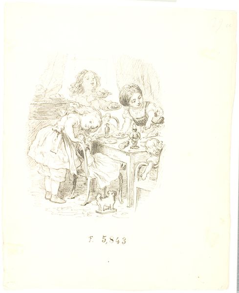 "To børn og en kone skræller kartofler," or "Two Children and a Wife Peeling Potatoes," is a drawing by Wilhelm Marstrand. Though undated, we can understand this piece through the lens of Marstrand's broader body of work as well as the socio-economic conditions of 19th-century Denmark. Marstrand often depicted scenes of everyday life. Here we see a domestic scene, a woman engaged in the laborious task of peeling potatoes, assisted by her children. This image subtly speaks to the gendered division of labor and the role of women in the 1800’s, which often relegated them to the domestic sphere. The presence of children underscores the cycle of labor and family life. Marstrand’s work often romanticized such scenes, but here we also see the realities of rural poverty and the daily grind necessary for survival. It invites us to consider the emotional weight of these lives, the burdens and the bonds of family. Does the artwork maintain traditional representation or develop alternative narratives?