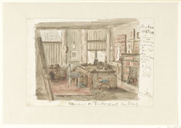 Editor: This is Martinus Rørbye's "Skrivebord med boghylder," or "Desk with Book Shelves," created in 1847. It’s a pencil and possibly etching drawing. The thing that strikes me first is how incredibly detailed the books look for what appears to be a quick sketch. What can you tell me about it? Curator: I see here a clear focus on the production of knowledge. Consider the desk not just as furniture, but as a site of intellectual labor. Rørbye has meticulously rendered the shelves stacked with books – the raw material for thought and writing. What kind of labour went into producing all of the artifacts presented on the shelves above the desk? And where were these materials sourced from? Editor: That’s interesting. I hadn’t thought about the desk as a workplace, but that makes sense, especially with the emphasis on books as materials. It looks like a rather domestic scene, and not very industrious. What kind of consumption do you imagine? Curator: We might interpret this as a romantic vision of domesticity and the life of the mind, however the abundance of commodities signals other concerns. Someone owns all these objects. Consumption on this level supports particular industries and perpetuates certain class divisions, while access to objects, materials, books, knowledge, is exclusive for the upper classes in the mid-19th century. Think of the labour involved in bookmaking alone. Editor: That completely shifts my perception of the image. Seeing the desk as a symbol of production and privilege gives it a whole new dimension, compared to my first thought of it just being a charming drawing. Curator: Yes, and remember to think about where those materials are coming from, as well as where their material components are going. Consider not just the artist's work, but the labour performed in creating all this art. Editor: Absolutely, thank you! Thinking about the materiality and means of production opens up a whole range of questions I hadn't considered initially.