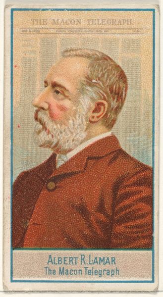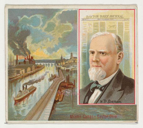 Curator: This print from 1887 comes from a series called "American Editors" by Allen & Ginter Cigarettes, and it showcases Charles A. Dana of *The New York Sun*. It combines a portrait with a cityscape of the New York Post Office. Editor: It feels incredibly... nostalgic. The soft lithograph style almost turns reality into a kind of dreamy, idealized past. Is it just me, or does this look like a Victorian-era Instagram post? Curator: Ha! Well, in a way, yes. Cigarette cards functioned as miniature collectibles, windows into different aspects of American culture. Dana, the editor, represents intellectual power, while the New York Post Office building stood as a symbol of progress and connectivity. Editor: I notice there is this elaborate telegraph equipment is placed to his side; so it suggests urgency, news dissemination… that information is power? Curator: Precisely. The telegraph next to Dana links him to the rapid flow of information shaping the era. His stern gaze is framed by the newspaper’s masthead, driving home the message that he is integral to "The Sun’s" identity. There is a calculated iconography to it. Editor: I wonder, how intentional was the placement of Dana’s likeness beside the post office depiction? Almost like, “Here are the two pillars upholding civilized society: News, and… well, mail." Or am I reading too much into this? Curator: It is more than possible; remember that the Post Office was THE place of communication for much of society for most of modern history. These buildings were purposely created to awe people, to remind them of the stability and promise of civil society. The pairing highlights interconnectedness. Information, government, transportation - these are the building blocks, both literally and figuratively. Editor: Thinking about those little cards…it’s fascinating how a mundane object transforms into a little cultural artifact. Sort of democratizing the arts…making accessible? Curator: That is well observed. In that small format, history becomes pocket-sized. Looking at it now offers us insight to those times. Editor: Totally. It reminds you to wonder about all the untold stories embedded in things we overlook.