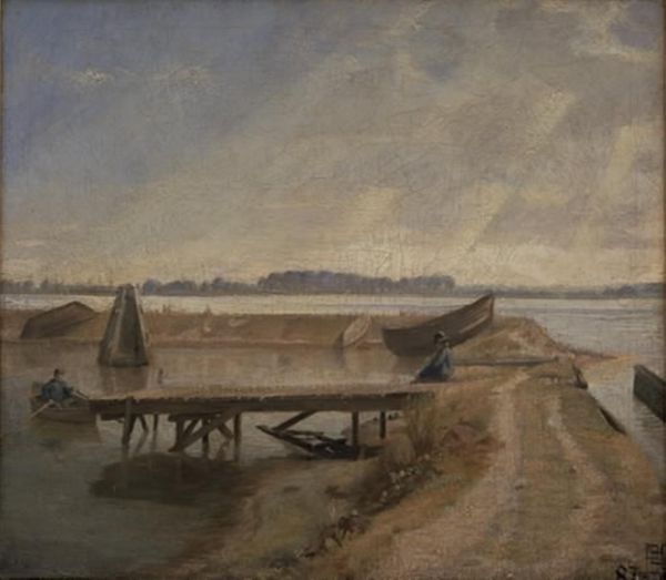 Edvard Weie made this painting of The Copenhagen Harbour with oil on canvas, but the year is unknown. The colour palette is muted, almost monochromatic, dominated by grays and browns that evoke a sense of industrial melancholy. The paint handling looks pretty direct, like a process of recording the scene rather than obscuring it with artifice. Looking at the texture, you can see the brushstrokes, especially in the water. They give a sense of movement and life to an otherwise still scene, and add energy and vibrancy to what might otherwise be an austere industrial landscape. See how the strokes make the water feel choppy, almost agitated, contrasting with the stillness of the structures on the land. I can imagine the artist standing there, battling the wind and trying to capture the light as it shifts. The way Weie captures the smoke billowing from the factories reminds me a little of Turner, who I'm sure he studied. But I wouldn’t want to pin Weie down too much. What’s interesting is that Weie finds a way to talk about industry and its impact on the landscape without being didactic. He leaves room for ambiguity.