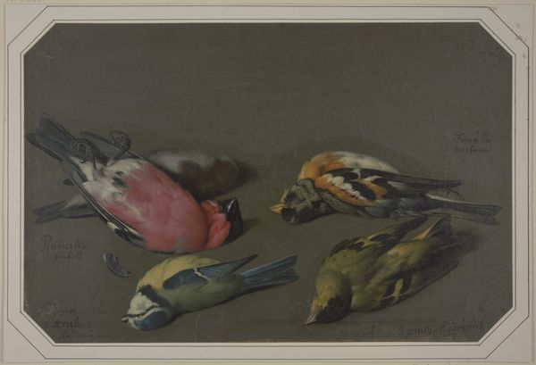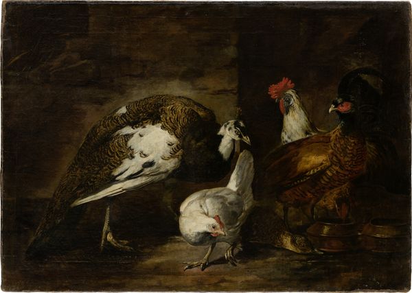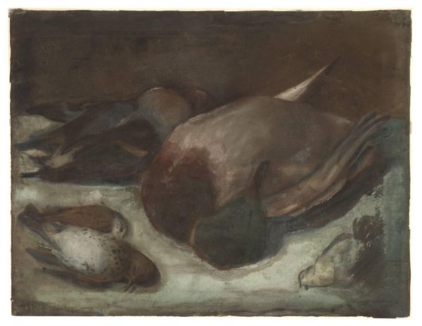 Curator: Here we have “Wildfowl on a Wooden Table,” an oil painting created sometime between 1648 and 1681 by an anonymous artist. Editor: My first impression is a muted still life. There’s something melancholic about the composition, the way the birds are piled, their feathers subtly illuminated against that dark background. It feels very staged. Curator: Yes, the arrangement speaks volumes. Looking at the technical aspect, consider the layering of the paint and how it brings depth and texture to the plumage. Notice the plain wooden table. It emphasizes the materiality and perhaps serves as commentary on social consumption during the Baroque era. Was this excess acceptable? What was the labor involved in the hunting and preparation? Editor: Beyond mere sustenance, these dead fowl transcend a culinary status. The image taps into complex cultural layers. Consider the symbolic weight of birds as emblems of freedom and the soul. Their confinement and stillness, arranged so deliberately, evoke mortality and the transience of earthly pleasures. Do we interpret them as simply decor for the dining table? Are we reflecting on wealth? Is it vanitas, or perhaps something darker? Curator: It makes you think, doesn't it? Looking at the different types of birds included suggests the skills and access of the hunter. It raises questions about resources, their management, and social status. Editor: Definitely. Moreover, there’s the stark contrast between their delicate beauty and their lifelessness. The image confronts us with the inherent tension between attraction and repulsion, so typical of that period. It makes the viewer consider the fragility of beauty, like the plucked rose so prevalent in Dutch still-life paintings. Curator: Exactly, the painting engages with our awareness of materiality in a way we might overlook today, now that it’s safely preserved in the Statens Museum for Kunst in Copenhagen. Its creation was an artisanal, perhaps collaborative, effort, reflective of societal standards. Editor: The visual vocabulary of the painting speaks volumes about cultural memory. Looking closely helps reveal a web of interwoven symbolic threads concerning beauty, death, and morality. Curator: Examining the techniques involved and thinking about societal structure invites speculation. Hopefully, our analysis can inspire further discussion about process, making, and consumption. Editor: Hopefully. We've had a fascinating discussion.