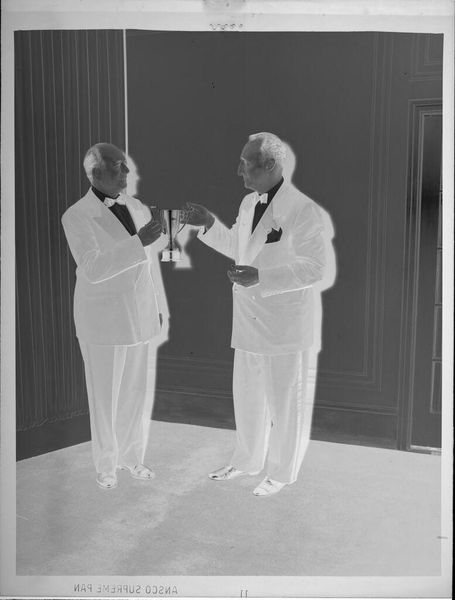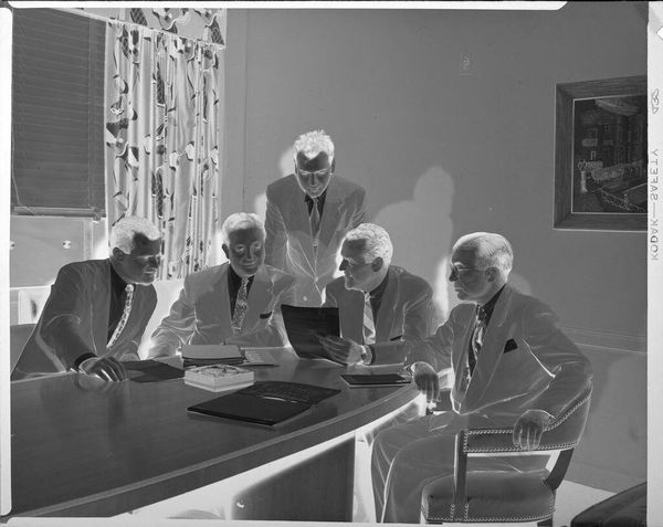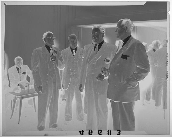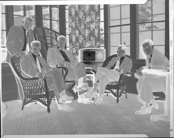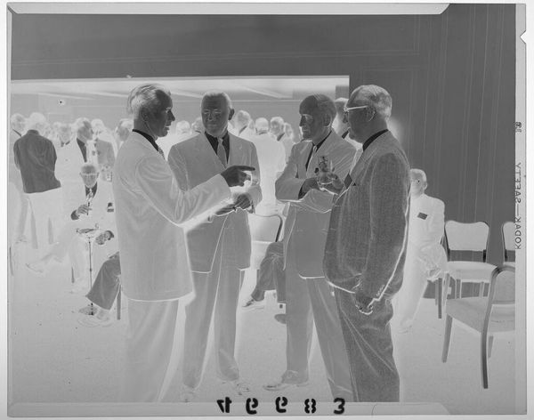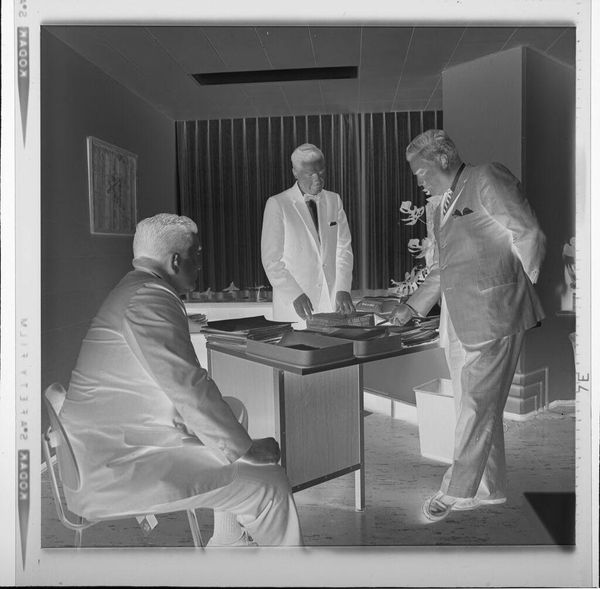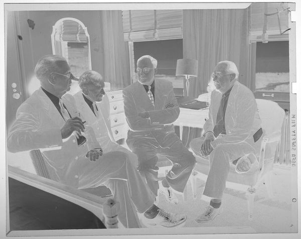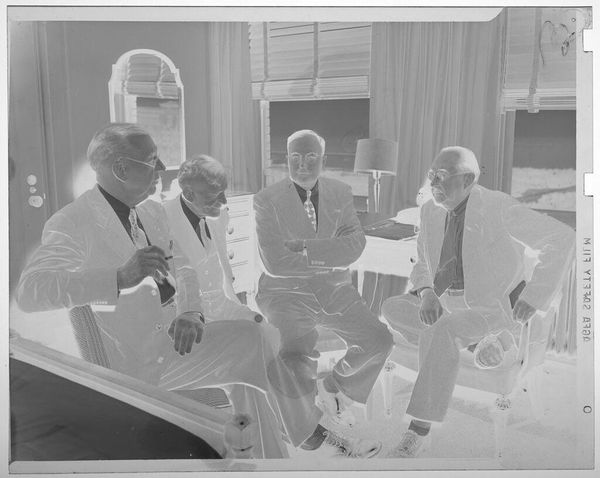 Editor: This photograph by Jack Gould shows three seated men in suits, two holding hats. The image is small, but there is a strong sense of mid-century formality. What symbols do you see at play here? Curator: The hats immediately suggest a departure from work, hinting at leisure or a social gathering. Their removal could symbolize a shedding of roles, a vulnerability. The suits, however, speak to ingrained societal roles. Notice how the composition implies a silent exchange, a ritualistic pause. What do you think their body language conveys? Editor: There’s a tension between relaxation and formality. Perhaps they are trying to appear relaxed, but are they really? Curator: Indeed. The visual elements combine to evoke a specific era and its expectations. Consider the cultural memory embedded in such images – what did it mean to perform masculinity in that time? Editor: That’s a fascinating way to look at it. Thank you, I’ve never considered the psychology of a photograph in such detail.