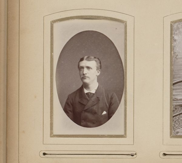 Editor: This is "Portret van een man met snor," or "Portrait of a Man with a Mustache," created between 1879 and 1885 by Johann Georg Hameter using albumen print photography. It's very sepia-toned, evoking a strong sense of the past. What strikes you about this portrait? Curator: I see a formal portrait, a man carefully posed, his mustache meticulously groomed, conveying a sense of Victorian masculinity. This image acts as a cultural signifier. Do you see how the oval frame, the specific style of dress, everything works to place him within a certain social milieu? What does that mustache signify to you? Editor: I suppose it projects an air of respectability, maybe even authority? Curator: Precisely. In that era, a mustache was often a sign of maturity, social standing, and even military bearing. This portrait becomes an emblem of its time. Note the meticulous presentation – it reveals how identity was carefully constructed and projected through photographic portraiture. Editor: So it's less about capturing an individual and more about conforming to societal ideals? Curator: Not entirely. Even within these constraints, the man's gaze, the slight furrow of his brow, suggests a unique personality striving to emerge. Consider how portraiture was democratized by photography. What kind of narrative do you imagine from looking at the portrait's placement within an album? Editor: It makes you wonder about its significance to a specific family, preserving a memory for generations to come. Thanks! I've gained a much better insight into the power of cultural memory contained in an object such as this. Curator: Agreed. It also prompts thinking about how photographic portraits have evolved to reveal cultural norms across time.