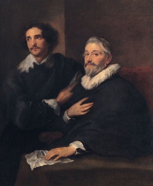 Curator: The first thing that strikes me is the interplay of gazes and how it guides our reading of this dual portrait. Editor: I agree. And there's something somber about it, isn’t there? The subdued palette, the heavy shadows. It feels burdened by history. I'd like to invite our listeners to join us as we unravel some of these themes contained in this painting—it's believed to be William Dobson's *Portrait of Henry Stone with His Son.* Curator: Note the deliberate staging: the older man, Henry Stone, is seated, almost weighed down as you pointed out, while the son stands rigidly behind, his hand resting somewhat awkwardly on his father's chair. This speaks volumes, doesn't it, about generational weight and expectation? We can feel the historical context here, that sense of lineage. Editor: Absolutely. There is such strong patriarchal undercurrents from what we observe here, a power dynamic reinforced by the formal conventions of portraiture from the Baroque period. Notice the contrast between the detailed rendering of their faces and hands, compared to the darker, less defined background— a technique employed to heighten the subjects’ psychological intensity. And Dobson subtly infuses symbolism with this particular portrait, no? It’s clearly more than just two men, father and son—it’s the past leaning over the present, isn't it? Curator: Indeed! And notice how the light falls so dramatically upon the father's face, particularly drawing our attention to his eyes looking up, as if anticipating the future, while the son's gaze is more direct, grounded in the present moment. The symbolism of inherited responsibilities feels quite pronounced. I think, too, that Dobson's work marks a cultural memory being handed from one generation to the next in the painting’s historical context and artistic representations. Editor: Yes, and if we situate it within broader discussions of masculinity, we see how expectations, performance, and succession influence depictions of male subjects in art—it challenges and complicates conventional readings of portraiture from this period. I think looking through those lenses gives the image an unexpected emotional resonance. Curator: It’s really remarkable how Dobson has embedded this emotional narrative within the formal elements of portraiture. Considering how family lineages have always influenced positions within society—it definitely presents some important context and background. Editor: For me, approaching the painting by investigating the portrayal of patriarchal power, Dobson offers not just a representation but also an invitation to challenge its very foundations, as we can see that even Henry Stone, although portrayed as the figure of respect and high standing, also represents weakness in comparison to the stronger posture of his son behind him. Curator: Such complex interplays with so few apparent details. I will be seeing this painting with new eyes from now on! Editor: Precisely! A deeper and definitely insightful perspective to this baroque-era art from Mr. Dobson, that is for sure.