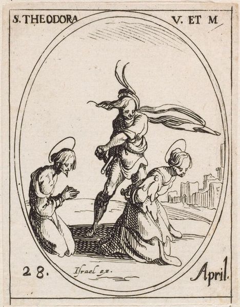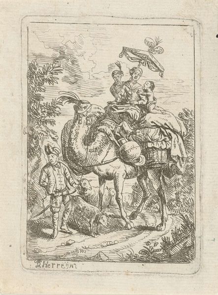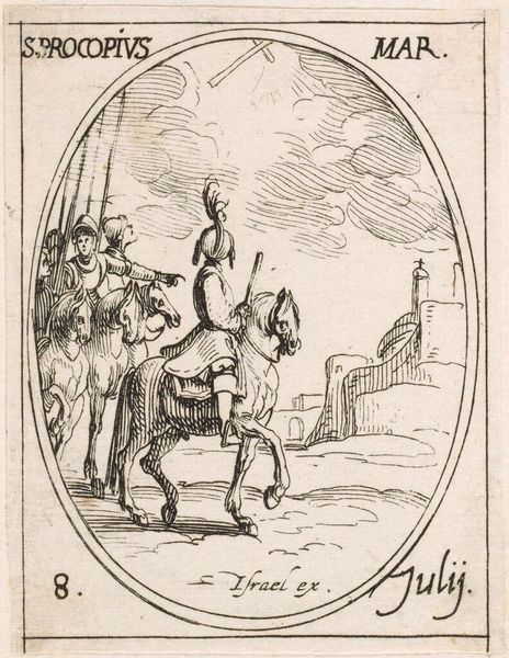 Curator: This is Jacques Callot's "Saint Julian," a small etching housed here at Harvard Art Museums. Editor: It feels oddly dreamlike, this little scene. Almost a mirage, with those spindly figures and the improbable camel. Curator: Callot, born in 1592, was a master of etching, and this work exemplifies his detailed technique. Notice the cross-hatching to build tone and form. Editor: The whole composition feels so light, almost ethereal. Like a half-remembered saint's day parade. Curator: Indeed. The social context of printmaking at the time allowed for wider distribution of such imagery, influencing popular devotion. Editor: It makes you wonder about the hands that held this tiny print, the stories they told around it. Curator: A testament to the power of the reproducible image, wouldn't you say? Editor: Absolutely, and to the enduring magic held within these delicate lines.