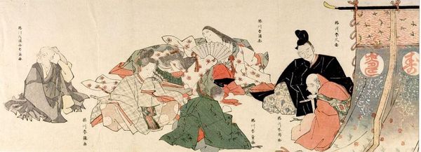 Curator: Looking at this triptych, "Three Courtesans" by Kitagawa Utamaro II, I'm immediately struck by the luxurious textiles. The detailed rendering of the fabrics really catches the eye. Editor: Yes, the sheer labor that goes into woodblock printing, especially with such intricate patterns, speaks volumes about the societal value placed on these images and the pleasure quarters they depict. Curator: Exactly. Consider the production process itself. Each color requires a separate block and meticulous carving. And the paper! Sourced and prepared, becoming the substrate for representing these women. Editor: And these weren't merely aesthetic objects. They circulated within a complex system of exchange, reflecting the courtesans' status and the cultural norms of the time. The triptych form itself speaks to a narrative arc, or perhaps, distinct aspects of their lives and labor. Curator: Perhaps also the consumer culture in which they emerged is key. The demand fueled innovation in printing techniques and broadened access to art beyond the elite. Editor: It really puts their position in society into perspective. These prints played a pivotal role in shaping public perception of these women and their profession. Curator: A fascinating glimpse into the intersection of art, labor, and society. Editor: Indeed, a multi-layered reflection on culture.