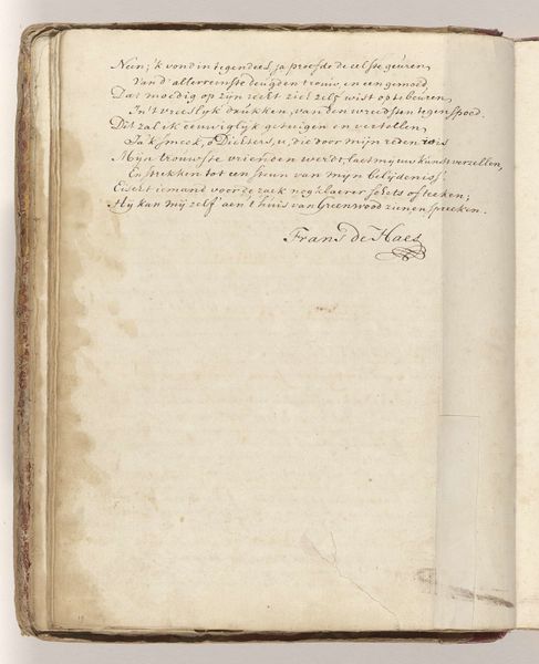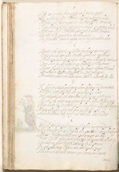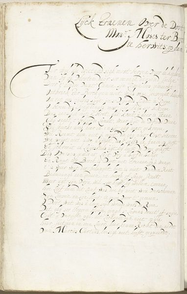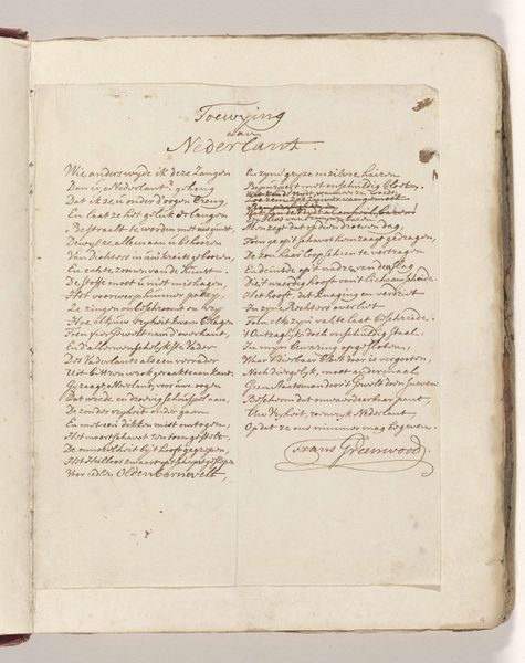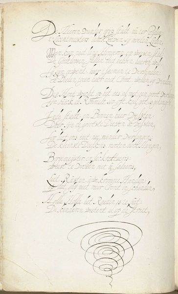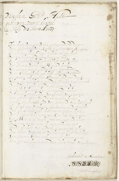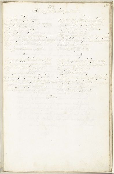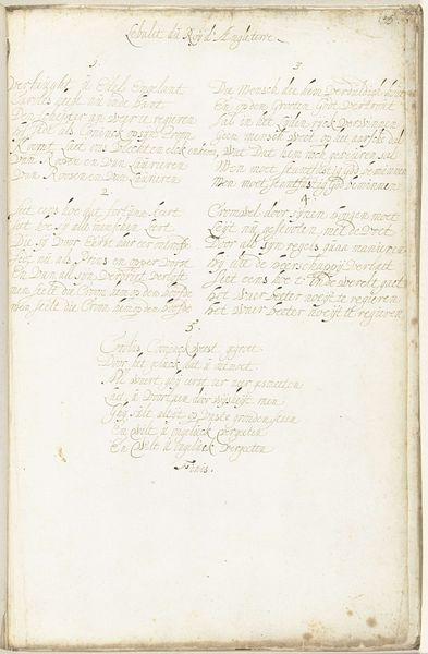 Editor: So, this is "Drinklied" from 1658, created by Gerard ter Borch. It seems to be a page from a personal sketchbook, done in ink and maybe watercolor on toned paper. The script is quite faded, like looking into the past itself. What can you tell me about the means of its production? Curator: Here, we see the artist not just composing an image, but carefully constructing script as a visual element. The hand-drawn typeface suggests a deliberate act of shaping language. It speaks volumes about literacy and social class during the Dutch Golden Age, and how knowledge production was linked to artisanal labor. Was creating the lettering similar to craftsmanship? Editor: I hadn't considered that angle. Is the choice of using handmade paper, rather than a print, itself significant? Curator: Absolutely. Handmade paper signals a commitment to process, to craft. This shifts the focus from simply transmitting information to celebrating the act of making. Do you see parallels between this deliberate construction and the rising merchant class, that also valued handcrafted, high-quality goods? Editor: That's fascinating! So it’s not just a drinking song, but an example of cultural and material values in practice. Was ter Borch highlighting wealth? Curator: In a way, yes. He makes very visible the means of textual and visual production; through careful examination of the material, "Drinklied" serves as both document and embodiment of the burgeoning Dutch economy in relation to skill. Editor: That's really changed how I see this. I was so focused on the script itself. Curator: By tracing how it's constructed from start to finish, this becomes less about *what* it says and more about *how* it came to be. Material reveals power.
